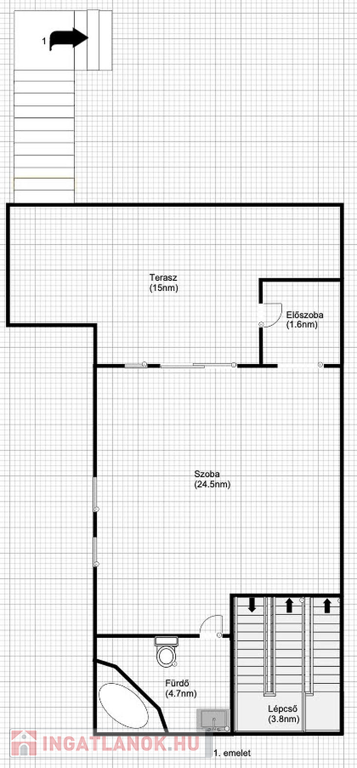 Az első emeleten egy előtér, egy szoba vagy nappali, egy sarokkádas fürdőszoba, valamint egy hatalmas, 15 nm-es terasz található, ahonnan szintén élvezhető a lenyűgöző dunai kilátás.