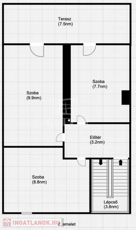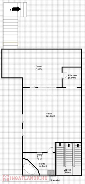 Belső terek jelenleg az emeleten 34nm, de az említett átalakítással 41nm-re bővíthető, az új terasz 10-15nm méretekig bővíthető.