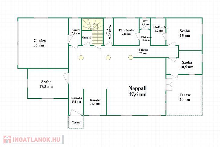 A teljes alapterület – beleértve a garázst, pincét és teraszt – 345 nm.