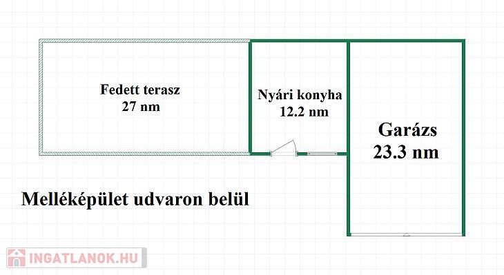 62 nm-es fedett terasz, külön tároló, garázs, nyári konyha és sütőgető.