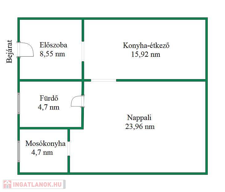 Elosztás: előszoba, konyha–étkező, nappali, zuhanyzós fürdő-WC, mosókonyha.