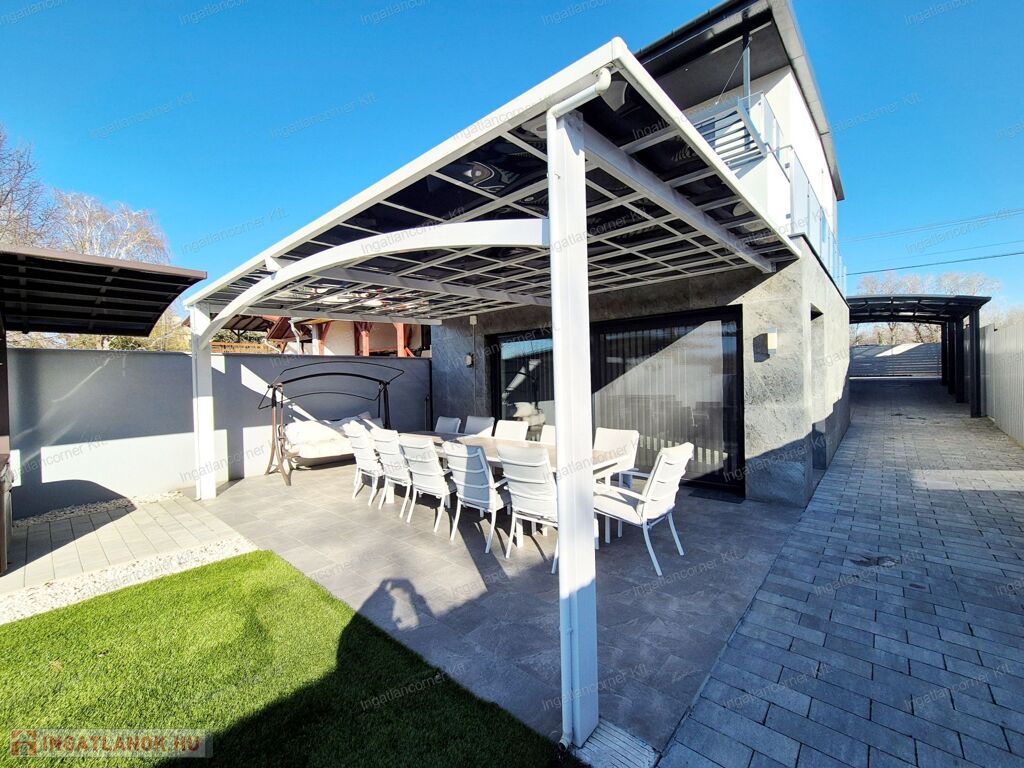 - TERASZOK: Az alsó szinten lévő teraszon fém szerkezetű fedést kaptak, az első emeleten fémből készült pergolás árnyékoló, a legfelső szinten pedig a terasz teljes fedést kapott. Továbbá a jakuzzi is fedésre került!