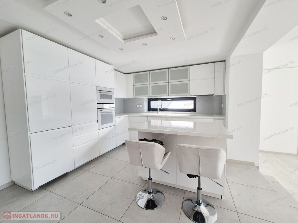 - KONYHA: L alakú magas fényű fehér beépített konyhabútor + reggeliző szigettel, Whirlpool beépített gépekkel (fehér színű: beépített mikró, légveréses sütő, 12 terítékes beépített mosogatógép, indukciós főzőlap, elszívó, beépített hűtő) a VÉTELÁR RÉSZÉT KÉPEZI!