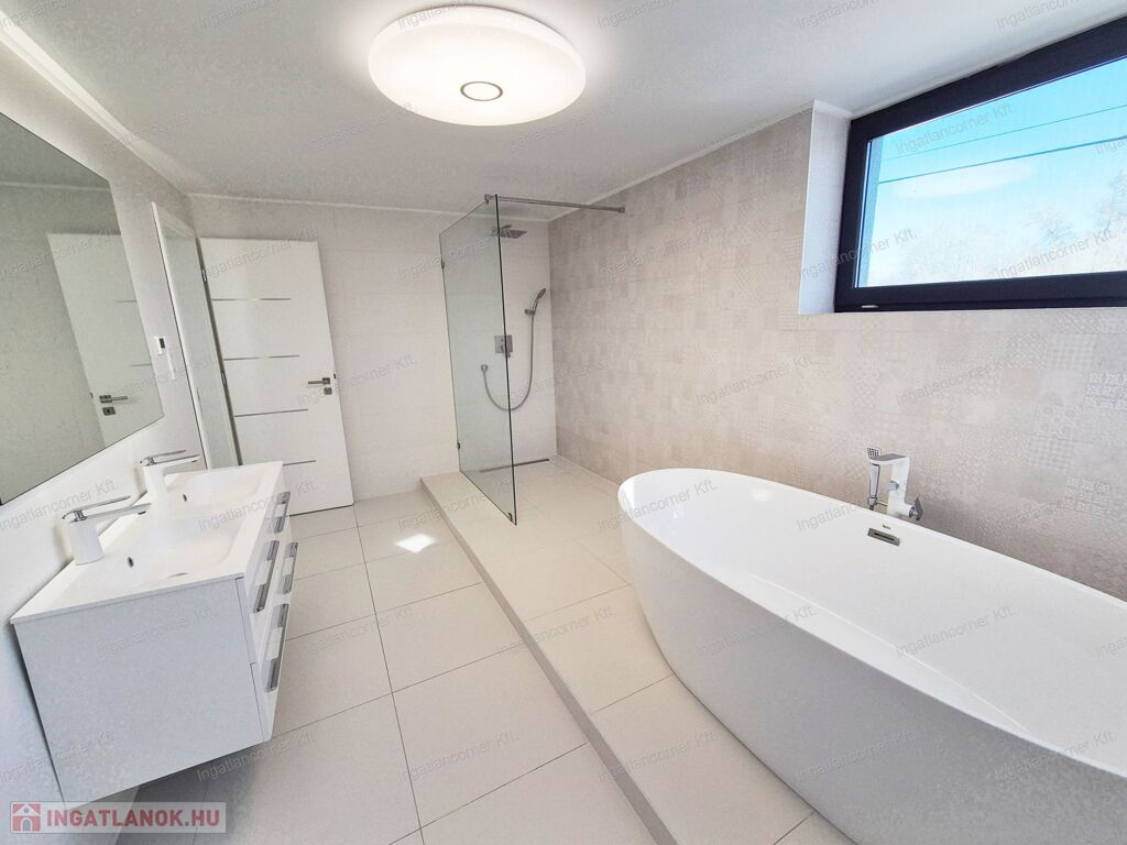 2. emeleten: egy úgyszintén nagyméretű hálószoba a hozzá tartozó FEDETT terasszal, és a szobából nyíló WELLIS szaniterekkel felszerelt nagyméretű, ablakos fürdőszoba: ahol WELLIS OVAL kád, üvegfallal ellátott épített zuhanyzó, duplamosdó a hozzá tartozó mosdószekrénnyel, wc-vel.