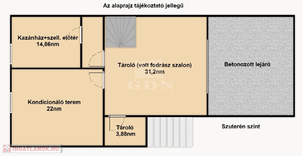 Itt egy 31,2nm garázs és 3,88nm-es tároló, 22nm nagyságú kondicionáló terem, valamint egy 14,86nm-es kazánház került kialakításra.