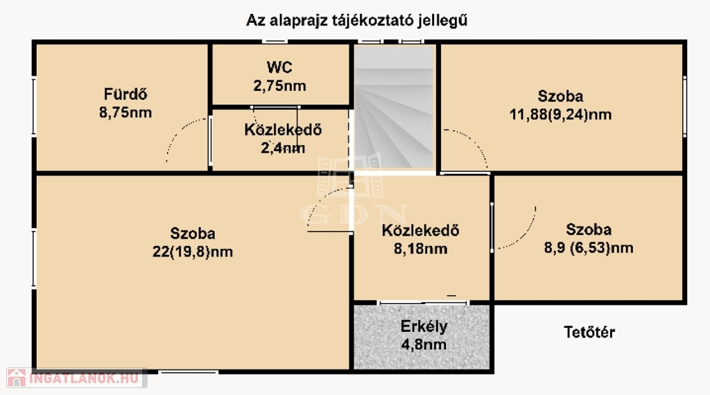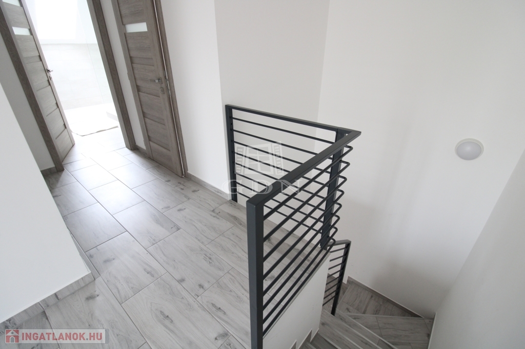 Felső szintre kényelmes fokkiosztású stabil lépcsőn és világos lépcsőházon keresztül juthatunk fel. Ezen a szinten egy 22nm (hasznos 19,8nm) szoba és két félszoba 11,8nm (hasznos9,24nm), 8,9nm (hasznos 6,53nm), 8,75nm-es fürdőszoba, 2,75nm illemhely, illetve 10,6nm közlekedő lett kialakítva. A közlekedőből juthatunk fel a 30nm nagyságú padlásra.