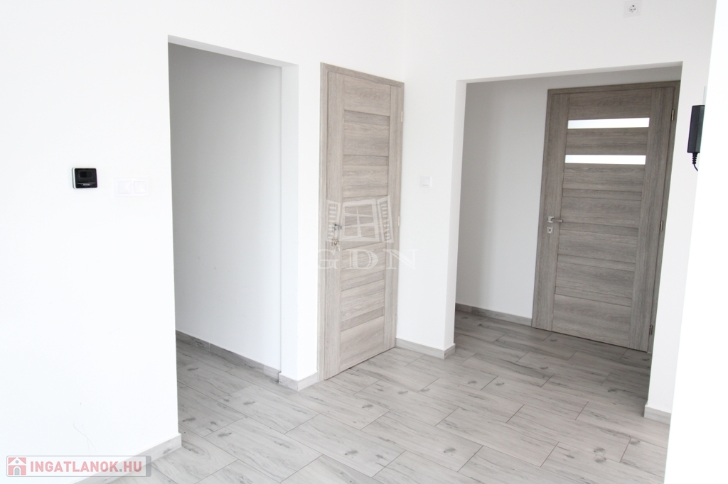 Földszintre egy 3,88nm-es szélfogón keresztül juthatunk be. Ezen a szinten 21,5nm nagyságú amerikai konyhás nappali, valamint az ehhez tartozó 3,98nm-es kamra, 24,3nm terjedelmű hatalmas világos szoba, (jelenleg ez a helység kettő egyenként 12 és 9nm-es szobára lett átalakítva) 7,9nm-es fürdőszoba, 1,6nm-es külön helyiségben kialakított WC és kézmosó, 4,4nm-es közlekedő, valamint 8nm nagyságú lépcsőház lett kialakítva. Ebből a lépcsőházból juthatunk le a szuterén részbe, illetve a felső szintre.