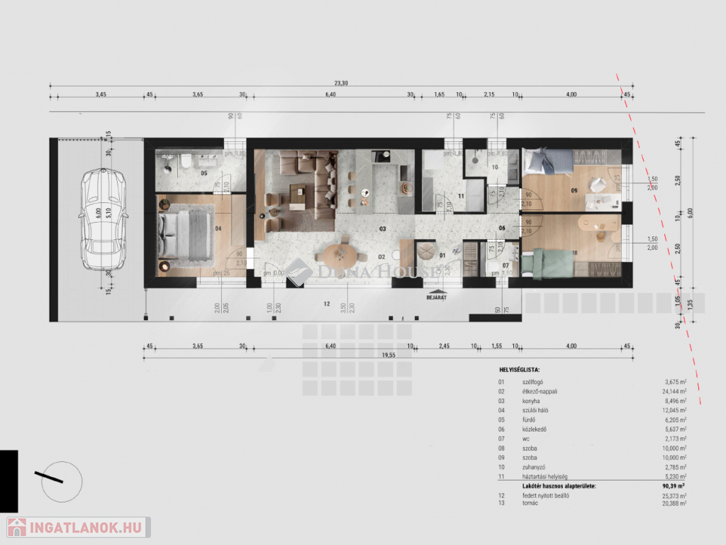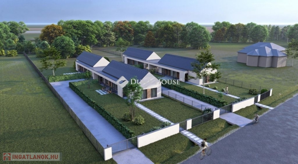 A település egyik rendezett utcájában kerülnek kialakításra az igényes megjelenésű, magas műszaki tartalommal bíró házak. Telkenként két lakóegység kerül kialakításra egymástól teljesen elválasztva, egyenként kizárólagos használatú kertekkel. A lakóépületek nettó alapterülete 90,39 nm, közéjük 1-1 autó elhelyezésre szolgáló, (25,4 m2) fedett autóbeálló kerül. A házak itt érnek össze, lakóhelyiség falai nem érintkeznek egymással, továbbá egy-egy felszíni gépkocsibeálló is kialakításra kerül. A házak mindegyikénél nyitott 20,4 nm alapterületű tornác jellegű fedett terasz szolgálja a teljes kényelmet, közvetlen kapcsolattal a nappaliból.