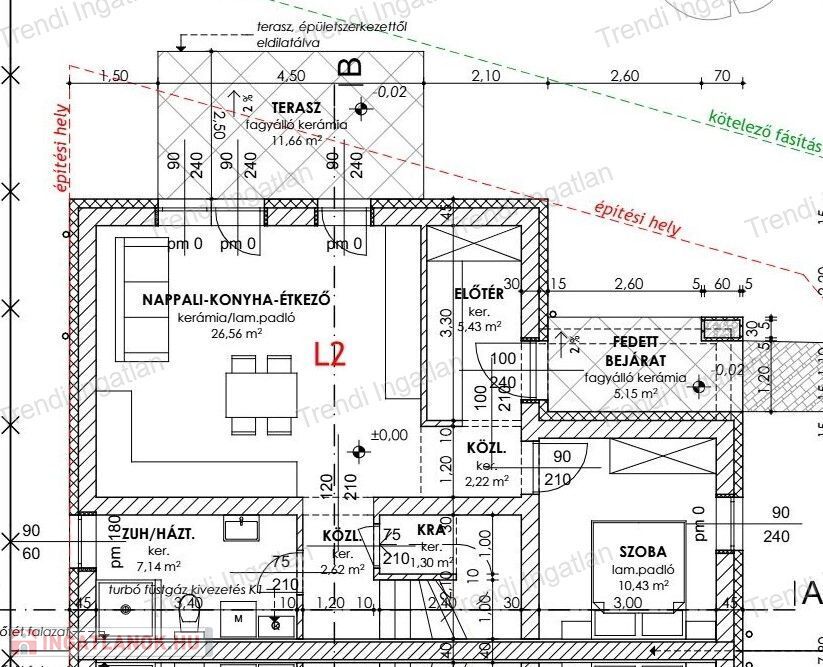 A ház 30-as falazóelemből, 15 cm-es homlokzati szigeteléssel, 3 rétegű műanyag nyílászárókkal került kivitelezésre. Fűtésről kondenzációs kazán gondoskodik padlófűtéssel.