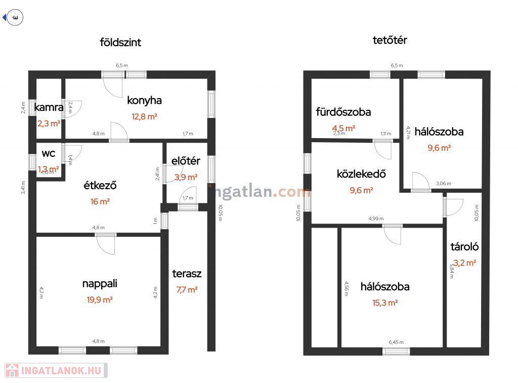 Földszint: nappali (19,9 nm), étkező (16,3 nm), konyha (12,8 nm), kamra (2,3 nm),