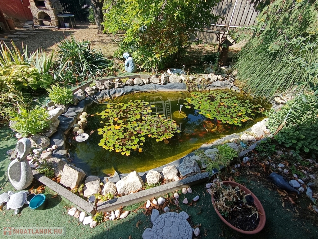 Az ingatlan egyik dísze a kis kerti tó, benne a gyönyörű színes halacskákkal.