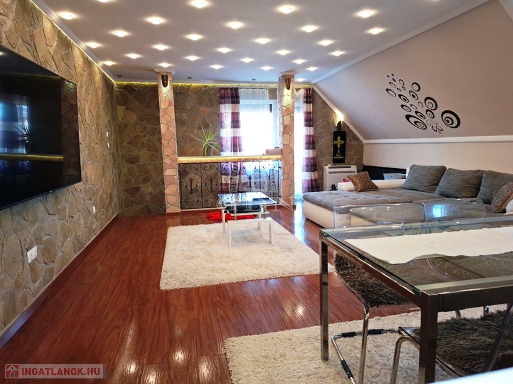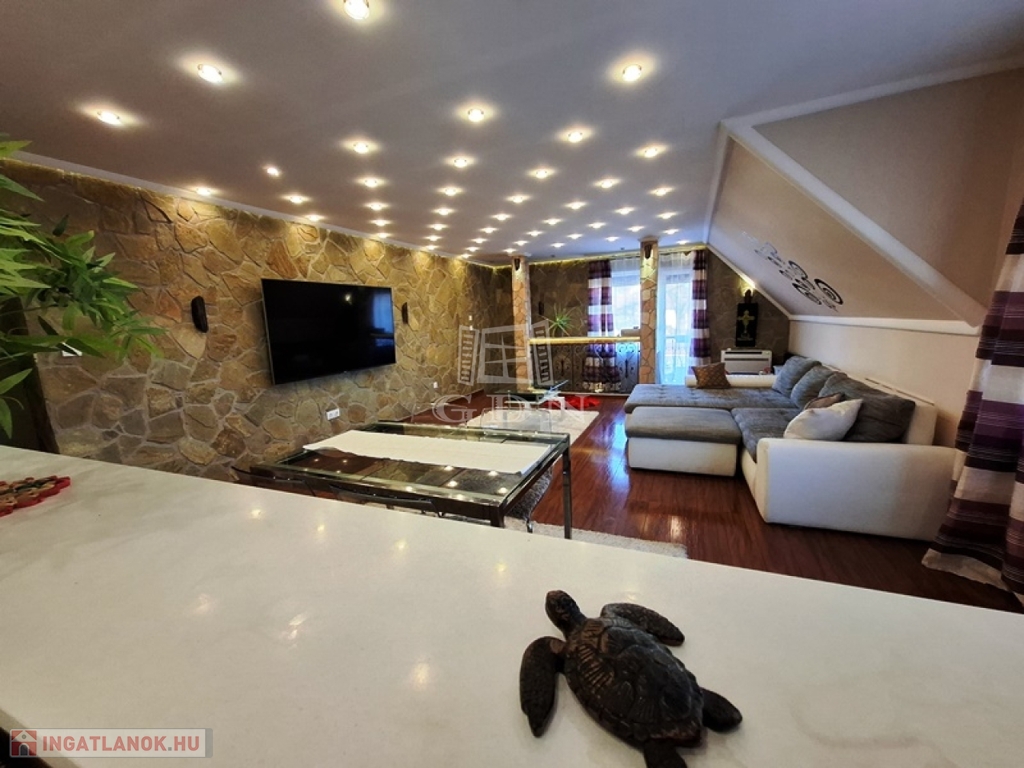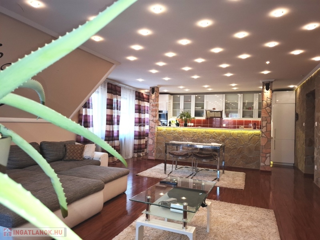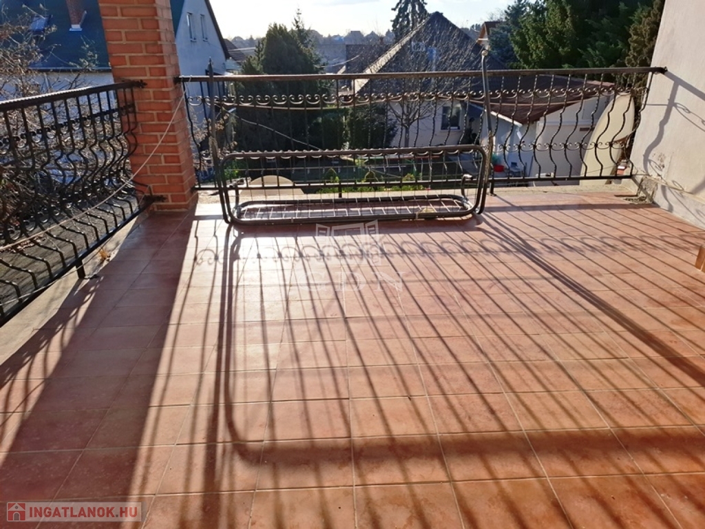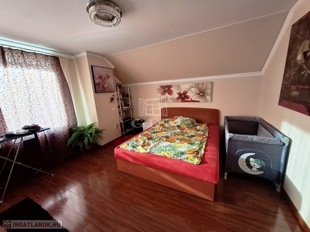A felső szint: 140 m2 előtér/lépcsőház, amerikai konyhás nappali, közlekedő, 3 lakószoba, 2 fürdőszoba, fedett terasz 14 m2, padlásfeljáró helyiségekből áll.