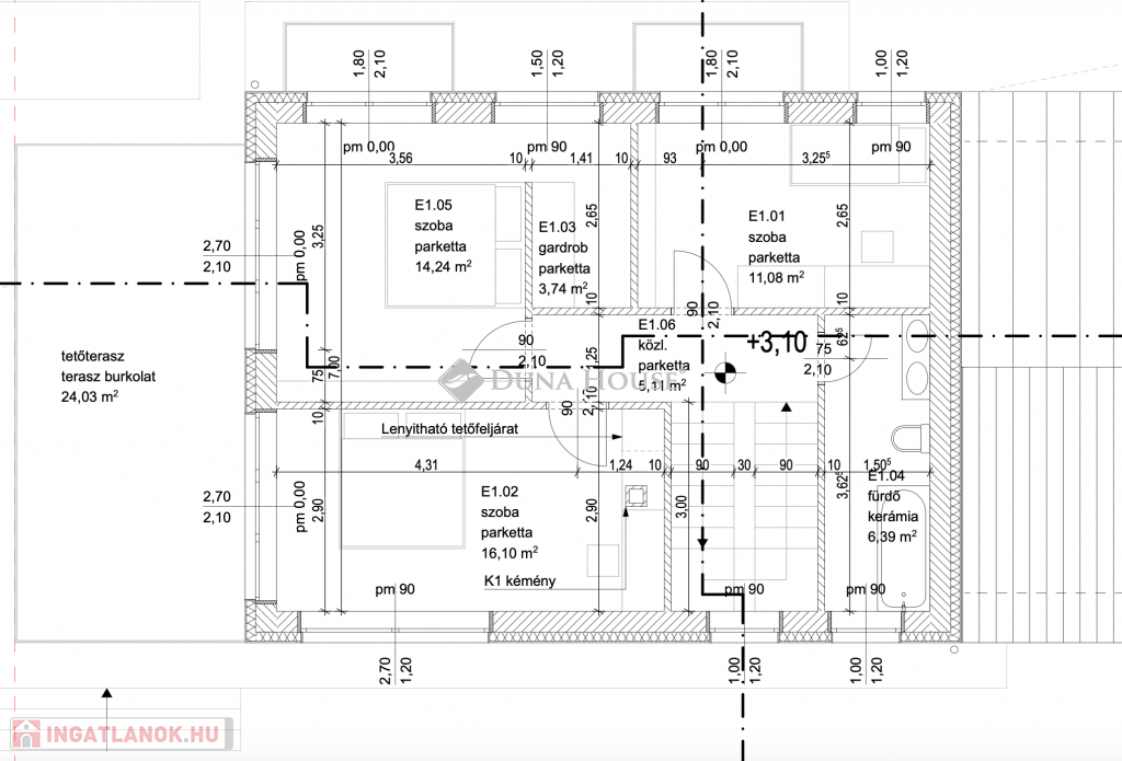 Betoncserép- 3 rétegű 6 légkamrás egyedi fa nyílászárók, kívül-belül antracit kivitelben- 2 db autónak kocsibeálló- Riasztó előkészítése- Szaniterek- Hideg/meleg burkolatok ( 10 000 Ft/m2 meleg: 7 000 Ft/ m2 )- Beltéri ajtók ( 90 000 Ft/ db )- Bejárati ajtó