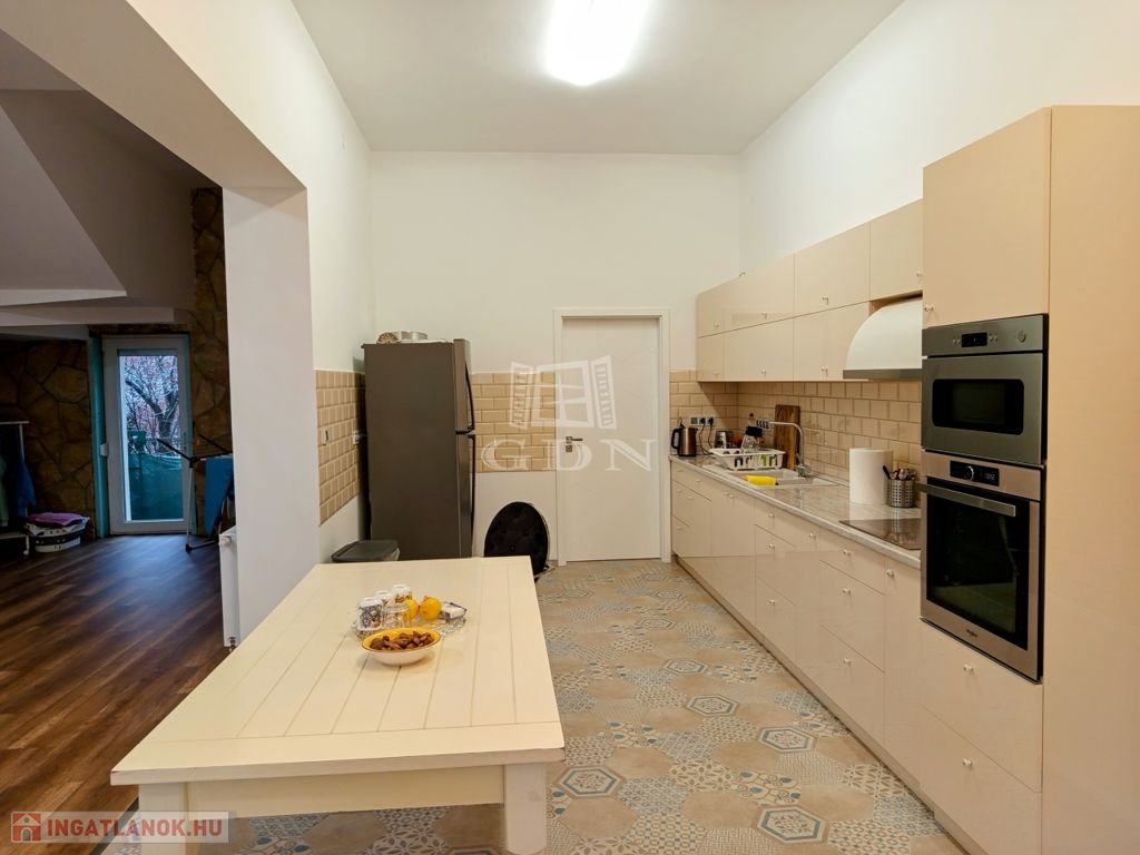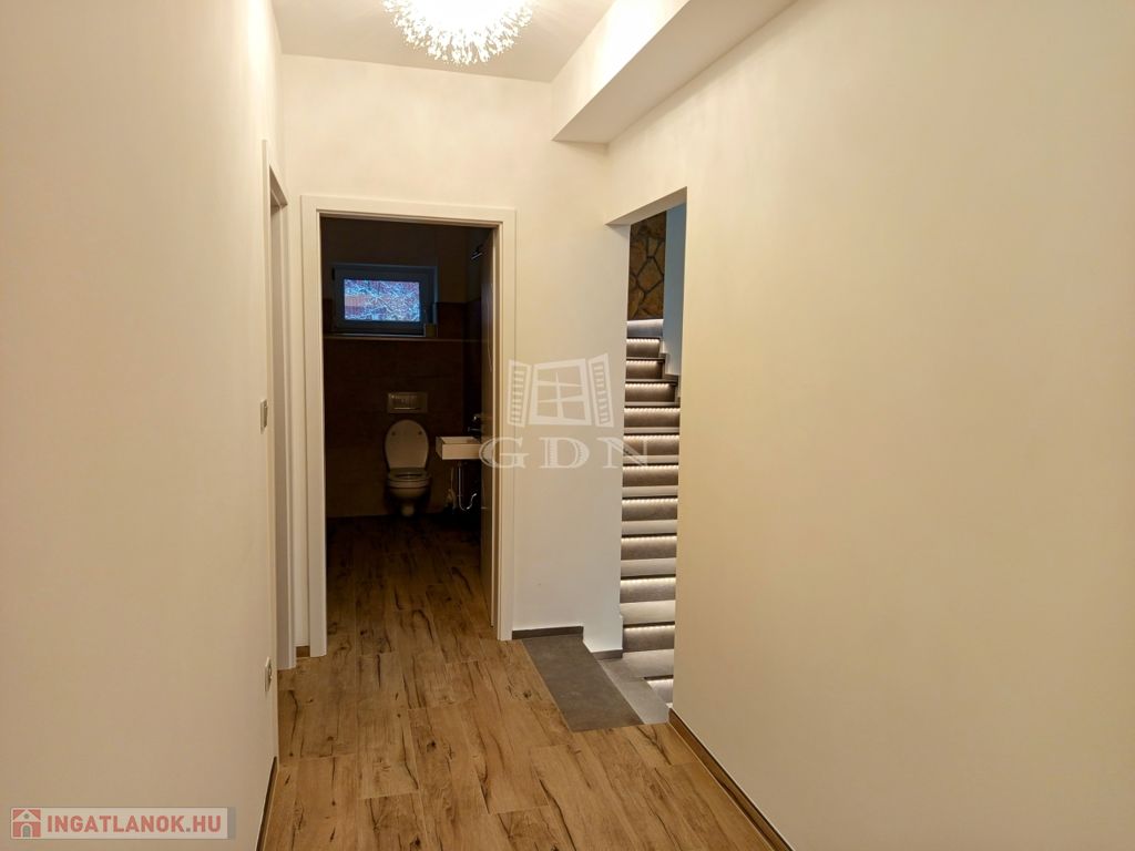 ÉRD Parkváros-Fenyves csendes részén ELADÓ egy teljesen felújított 195 négyzetméteres, három szintes családi ház! Az alagsorban , kétállású garázs és az épület gépészete található 39,67 nm-en. Elektromos töltésrendszer, két gépjármű részére, a bejárati ajtó elektromos, távirányítóval működik. A garázsba megérkezve lépcső visz fel a földszintre. Ezen a szinten egy zuhanyozós fürdő szoba + WC 6,4 nm, egy 16,88 nm szoba amelyből egy kádas, WC fürdő szoba 5,83 nm, nyílik. A nappali 28,11 nm, melyből a konyhába és az étkezőbe 20,83 nm es jutunk. Ezen a szinten még található az előszoba 5,08 nm, közlekedő 6,97 nm, éléskamra 2,86 nm és egy gardrób 2,15 nm-es helység.