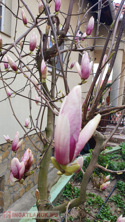A tágas kertben csodálatos növényzet, termő gyümölcsfák, bokrok (hurmafa, málna, ribizli, cseresznyefa, több fajta barackfa,szeder, magaságyás stb.) található.