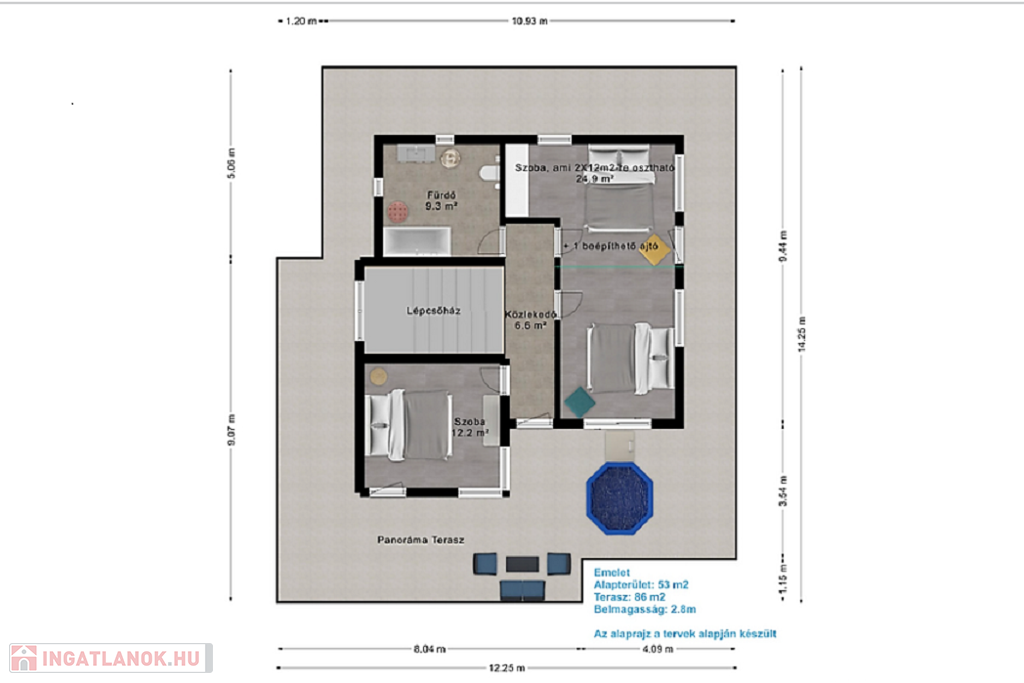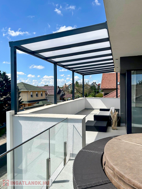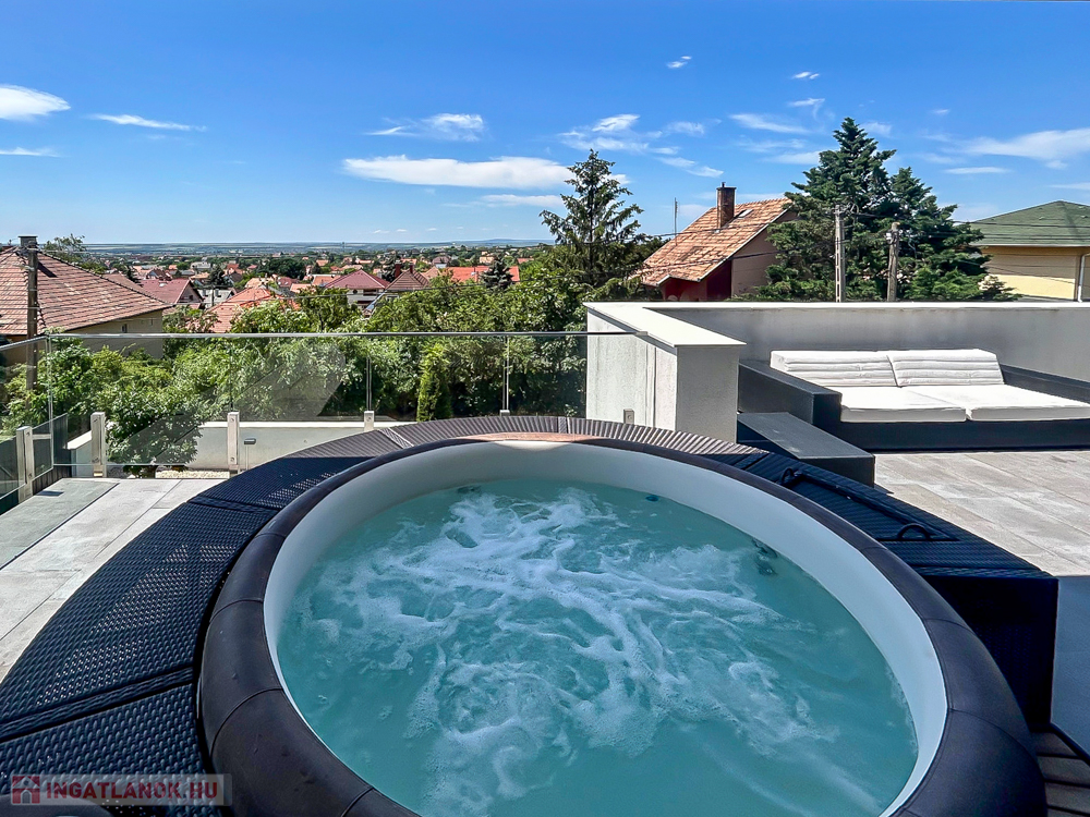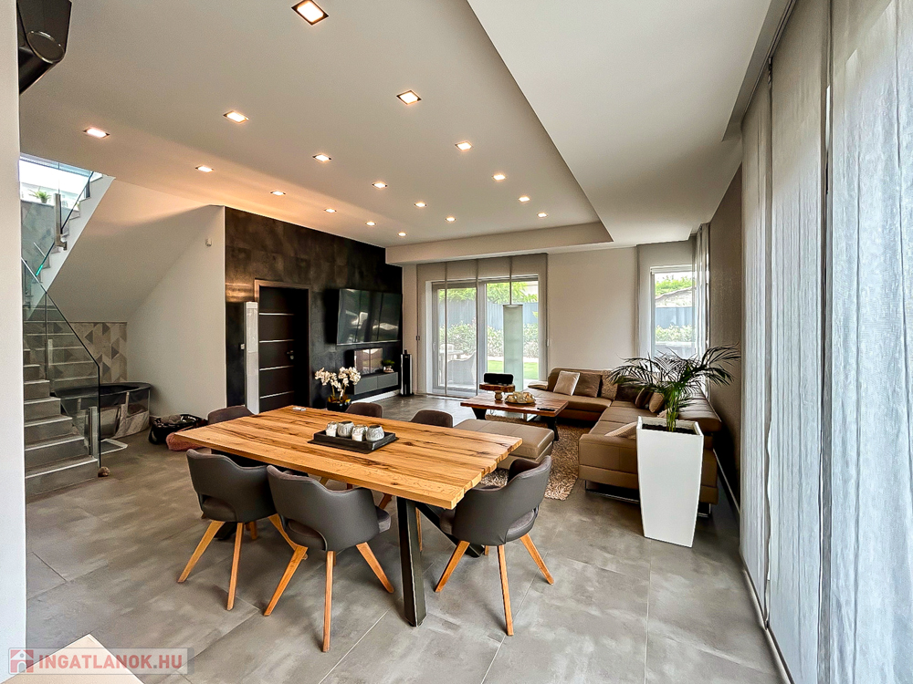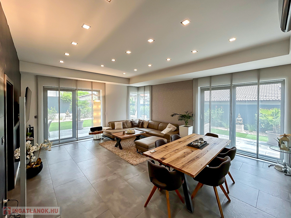 Az újszerű állapotban lévő ház nettó alapterülete 176 nm, melyből a lakótér 140 m2 és nappali+ három háló+ 2 fürdőszoba elrendezéssel. A házat körül ölelő teraszok, összesen 160 m2-el növelik meg az életteret és jórészt fedettek is.