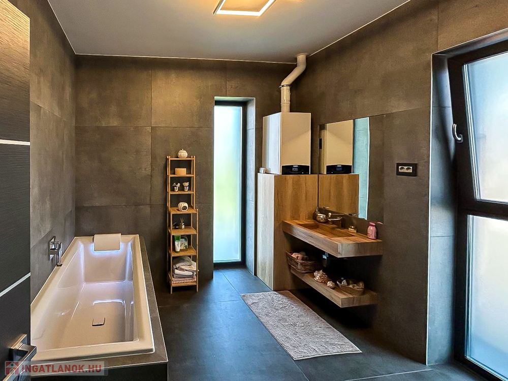 Meleg víz ellátása és fűtése kondenzációs kazánnal üzemel, utóbbi padlófűtésen keresztüli hőleadással. Az ingatlan természetesen klimatizált.