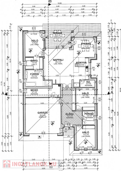 A ház helyiségei: 3 háló (12.2 m2, 12.1 m2, 12.1 m2) + nappali-konyha-étkező (50.5 m2) + 2 fürdő (10.2 m2, és 4.8 m2) + gardrob (7m2) + garázs (36 m2) +mosókonyha-kazánház (9.5m2 ) + gardrob (7 m2) , + közlekedő+gardrob (16.7m2)+ hátsó, kertkapcsolatos terasz (29.3 m2,ebből fedett kb 20 m2)