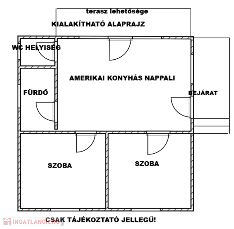 A közlekedő és a konyha, valamint kisszoba közötti falak bonthatók, válaszfalak, tehát ezek bontása után kialakítható egy modern, amerikai konyhás nappali, 2 szobás, fürdőszobás lakóház.