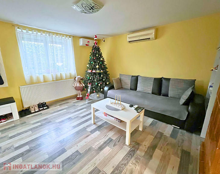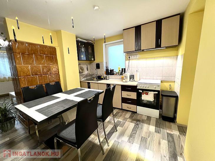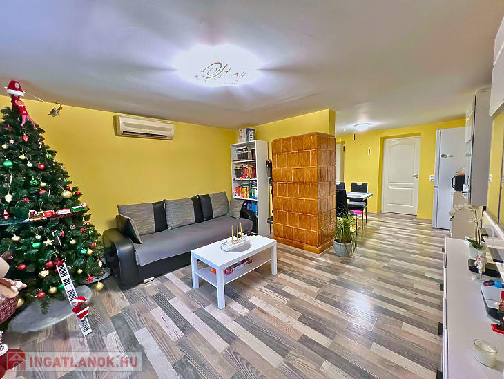 Az ingatlan központi helysége egy praktikusan kialakított, részben szeparált amerikai konyhás, klimatizált nappali, amely dk.-i irányba tekint. A térelválasztó falban kialakításra került egy cserépkályha, amely kellemes és meleg hangulatot kölcsönöz a térnek.