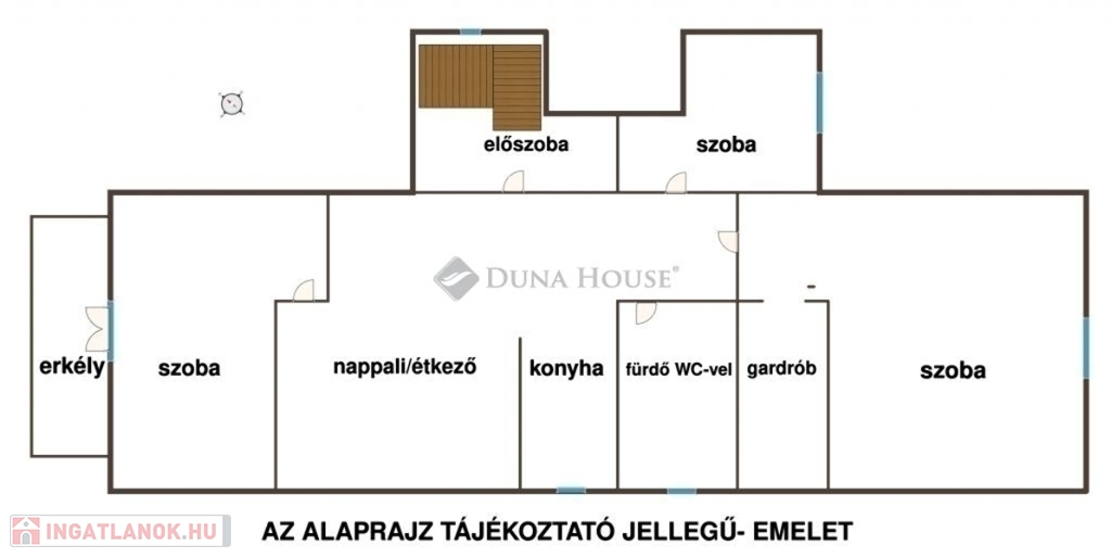 Az emeleten előszoba, egy tágas amerikai konyhás nappali és három hálószoba található. Az egyik szoba erkélyes, a legnagyobb szoba pedig saját gardróbbal rendelkezik.