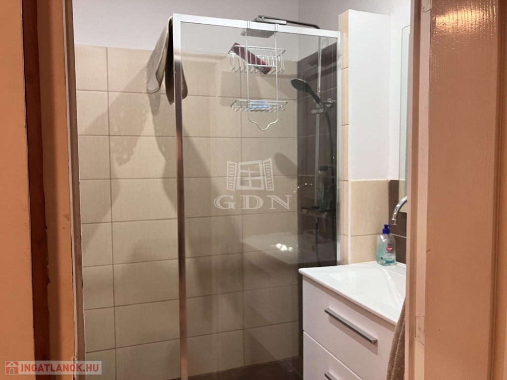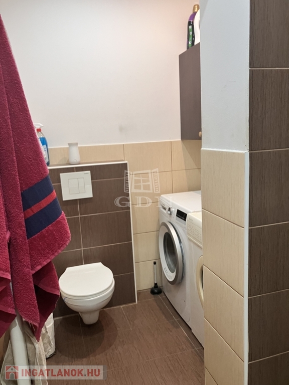 A fürdőszoba modern kialakítású, zuhanykabinnal, külön WC-vel, mosógép elhelyezési lehetőséggel.