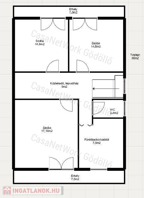 Az emeleten 3 nagy méretű hálószoba, külön WC és fürdőszoba, valamint szimmetrikusan mindkét irányba 2 loggia is található.