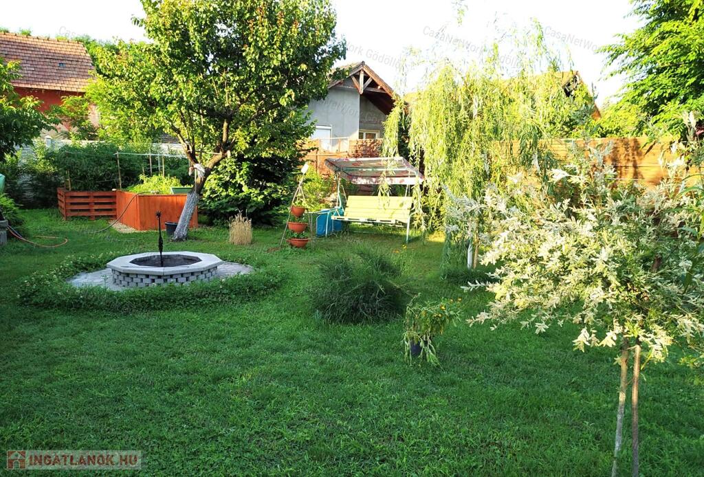 Extrák: ásott kút, szerszámos épület, magas ágyás, 25m2 fedett autóbeálló, rendezett, dísznövényekkel ültetett utcai előkert, kert; riasztórendszer