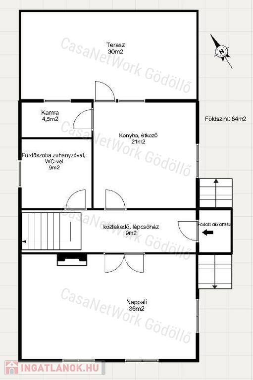 A földszinten 21m2 konyha és étkező a 36m2-es nappalitól elkülönülve, 30 m2 grill terasszal, kamrával és fürdőszobával biztosítja a kényelmes lakóteret.