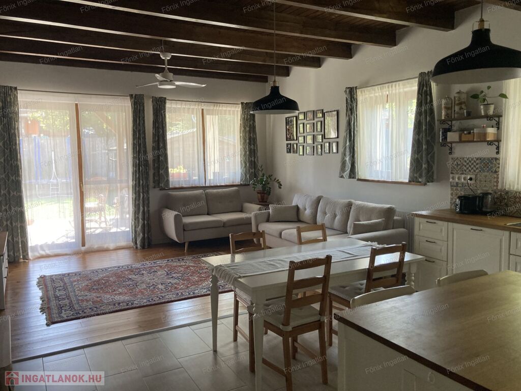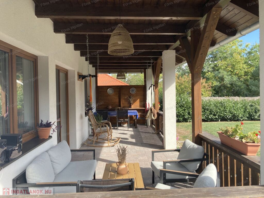 A nappaliból közvetlen kijárat nyílik a fedett teraszra, ahol könnyedén tarthatók családi ebédek, baráti összejövetelek vagy nyári vacsorák.