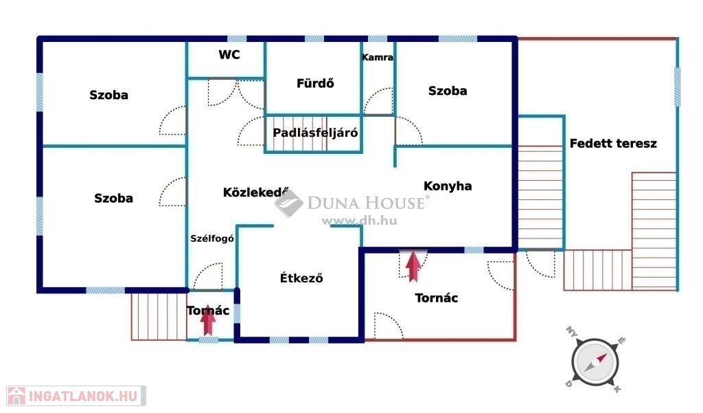 - Főépület: Kétszintes családi ház, két különálló lakrésszel