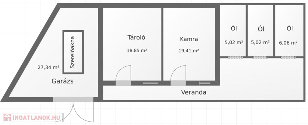 A ház egy 2864 m²-es telken fekszik, ahol egy melléképület is található, melynek része egy 27 m²-es szerelőaknás garázs, ez különösen vonzó lehet autószerelők vagy hobbi barkácsolók számára. A garázs mellett található egy kamra és egy tároló helyiség, amelyek közel azonos méretűek (19 m²).