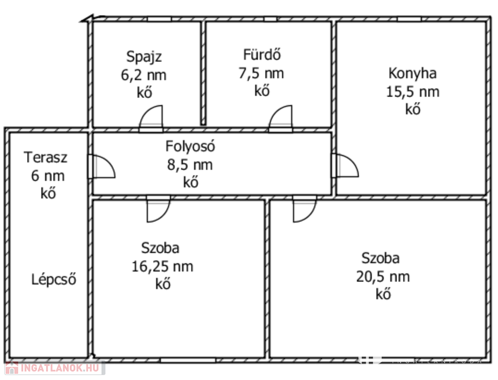 Az ingatlanban egy konyha, 2 szoba, fürdőszoba, kamra, és közlekedő található. A ház alápincézett, az ablakok redőnyözöttek.