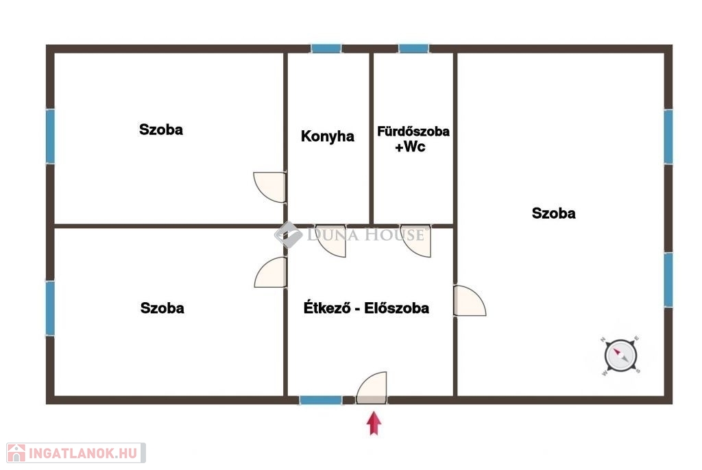 Az ingatlanban 3 különnyíló szoba, egy akár nappalinak is használható étkező, egy konyha, és egy fürdőszoba+wc helyiségek kaptak helyet. A helyiségek mindegyike ablakos, így a ház fényviszonya, és szellőztethetősége is kitűnő.