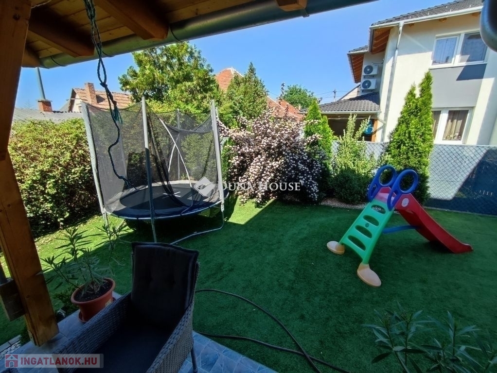 Az ingatlanhoz tartozik egy 250m-es kert, mely prémium minőségű műfűvel borított így igen alacsony fenntartási költséget von maga után. Az udvar méretéből adódóan kiválóan alkalmas baráti és családi összejövetelekre, ahol nyugodtan kihasználhatjuk a környék adta nyugalmat. A szomszédság kedves és csendes, mely elengedhetetlen egy nyugodt Életvitelhez, jó lakóközösség jellemzi a környéket.