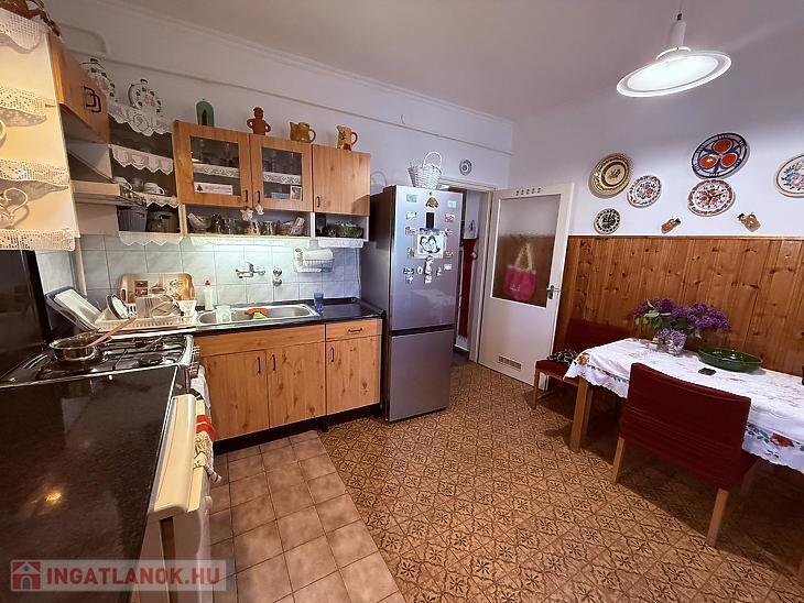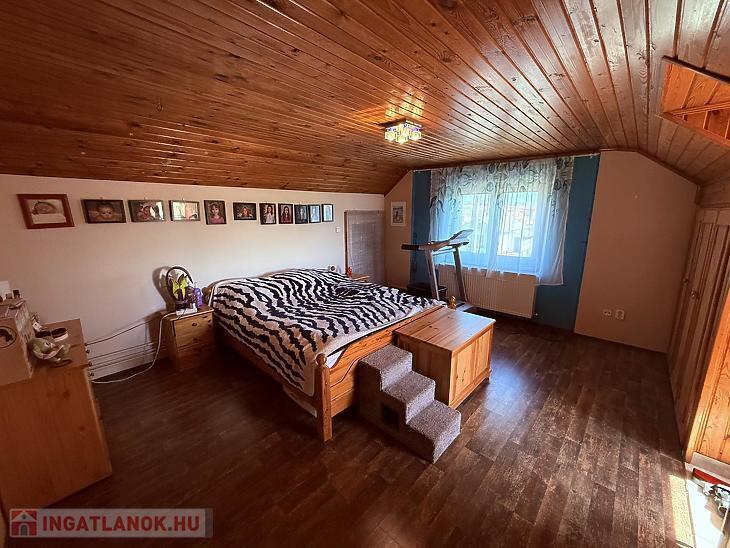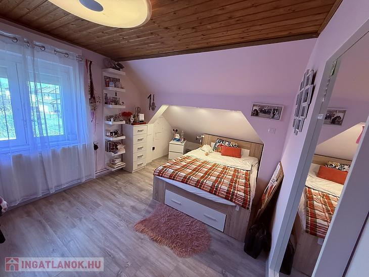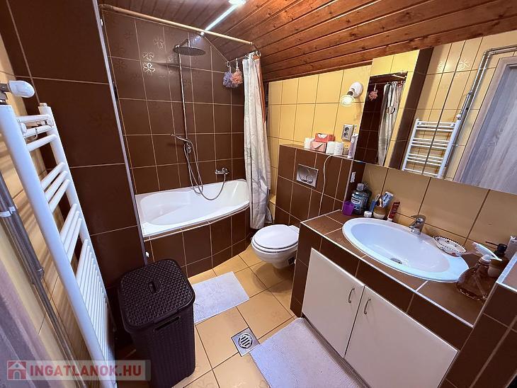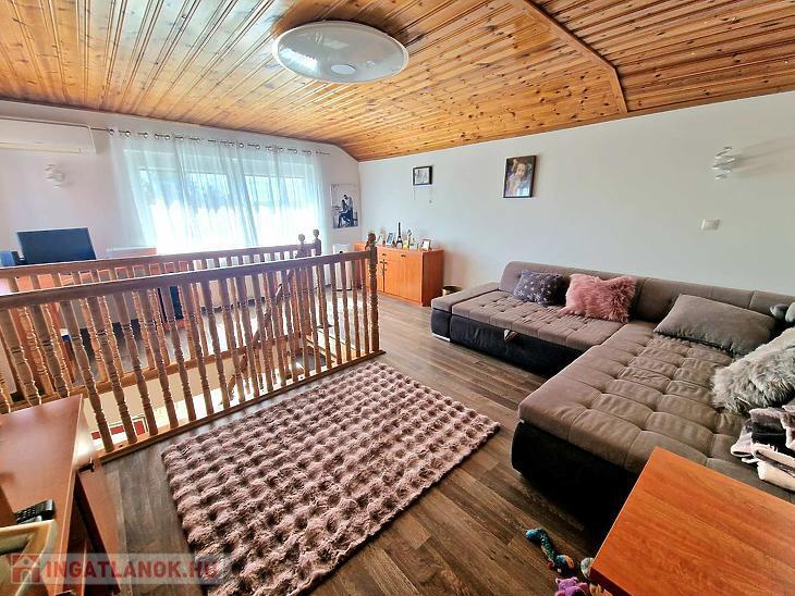 A felső lakás kb. 105 nm, tágas nappalival, 2 hálószobával beépített szekrényekkel, külön gardróbbal, konyha-étkezővel és kádas-zuhanyzós fürdővel. Műanyag, dupla üvegezésű nyílászárók szúnyoghálóval, részben elektromos redőnyökkel, 2 klíma (ebből egy 3,5 kW-os), a fűtést Ariston kondenzációs kazán biztosítja.