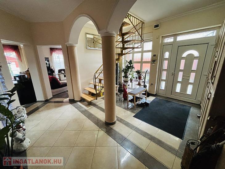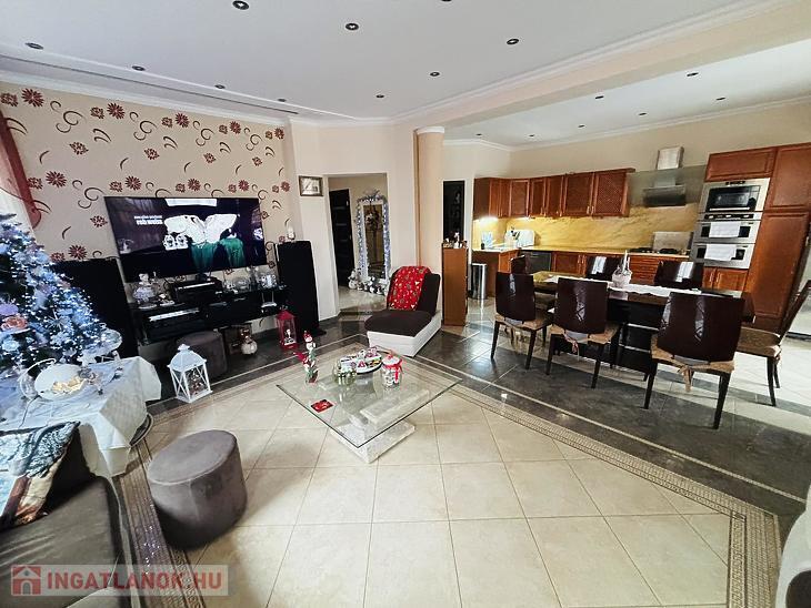 Az ingatlan 38-as porotherm téglából épült, modern dryvit szigeteléssel, prémium minőségű, hőszigetelt műanyag nyílászárókkal felszerelve, beépített redőnyökkel. A házba lépve egy tágas, 45 m²-es amerikai konyhás nappali fogad, amelyben a falba rejtett házimozi rendszer és leereszthető projektorvászon teremt igazi mozis élményt. A földszinten két kényelmes hálószoba, fürdőszoba, WC, mosókonyha, előszoba és egy fűthető garázs kapott helyet.