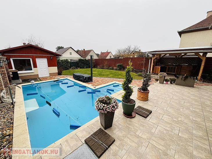 A hátsó kert igazi privát wellness- és pihenőzóna. Az 50 m²-es fedett teraszról egy 7,5 × 3,5 méteres, 1,6 m mély, kiváló felszereltségű fűthető medencéhez jutunk, mely ellenáramoltatóval, automata vegyszeradagolóval, vízlágyítóval, valamint nyak- és hátmasszírozóval is rendelkezik. A gépészetet egy külön, 25 m²-es melléképület rejti, ahol egy szauna is kialakításra került A kertben ezen kívül fedett kerti sütögető is szolgálja a maximális kikapcsolódást.