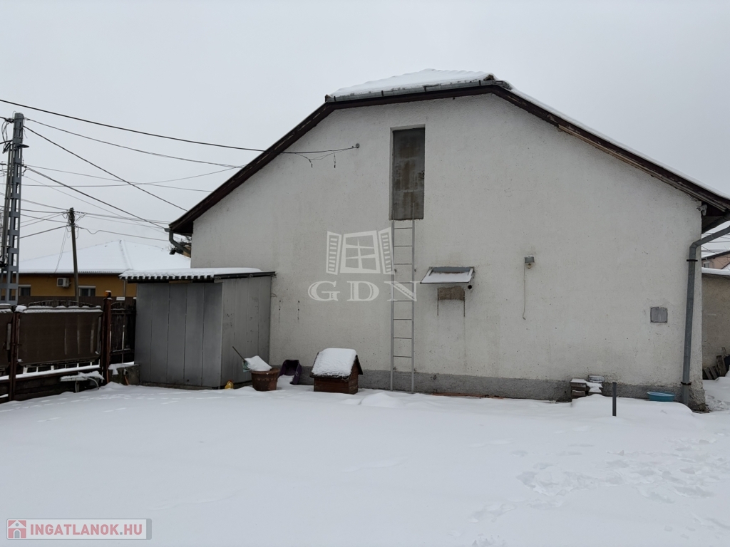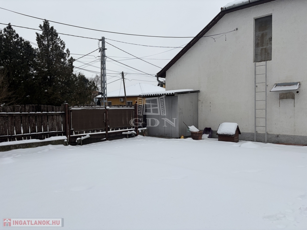 A ház elkőkertet követően helyezkedik el a telken, majd mögötte egy tégla szerkezetű kb 15 nm nagyságú tároló található, amely mellett 6 autó beállására alkalmas udvar fekszik. A terület rendezett, körbekerített.