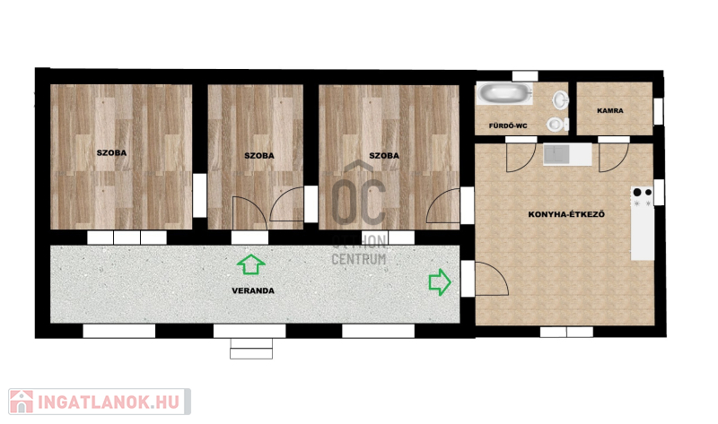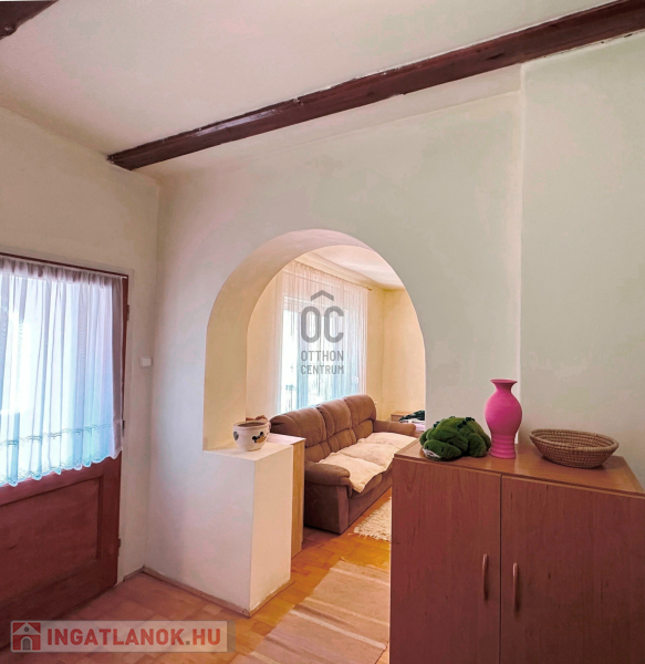 A falusi környezetébe illeszkedő épület 3 szobáján kívül tágas konyha étkező, kamra és egy fürdőszoba-WC helységekből áll.