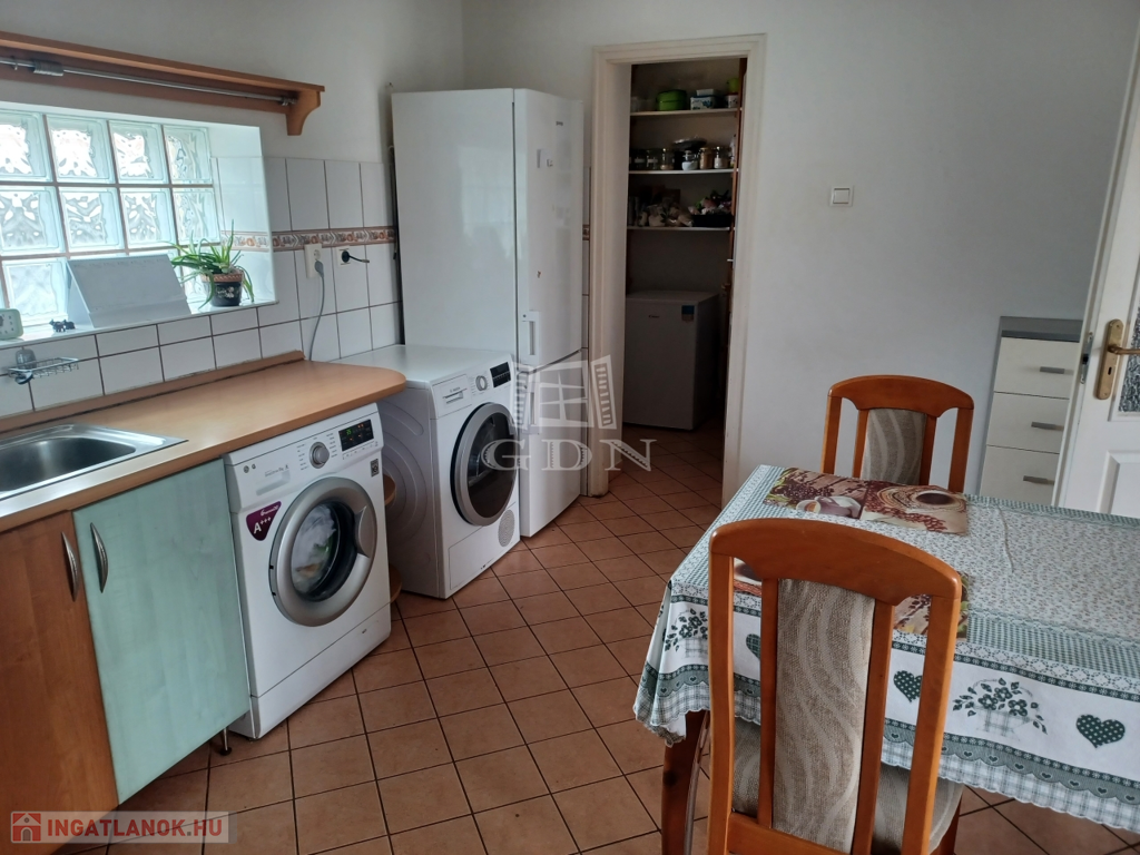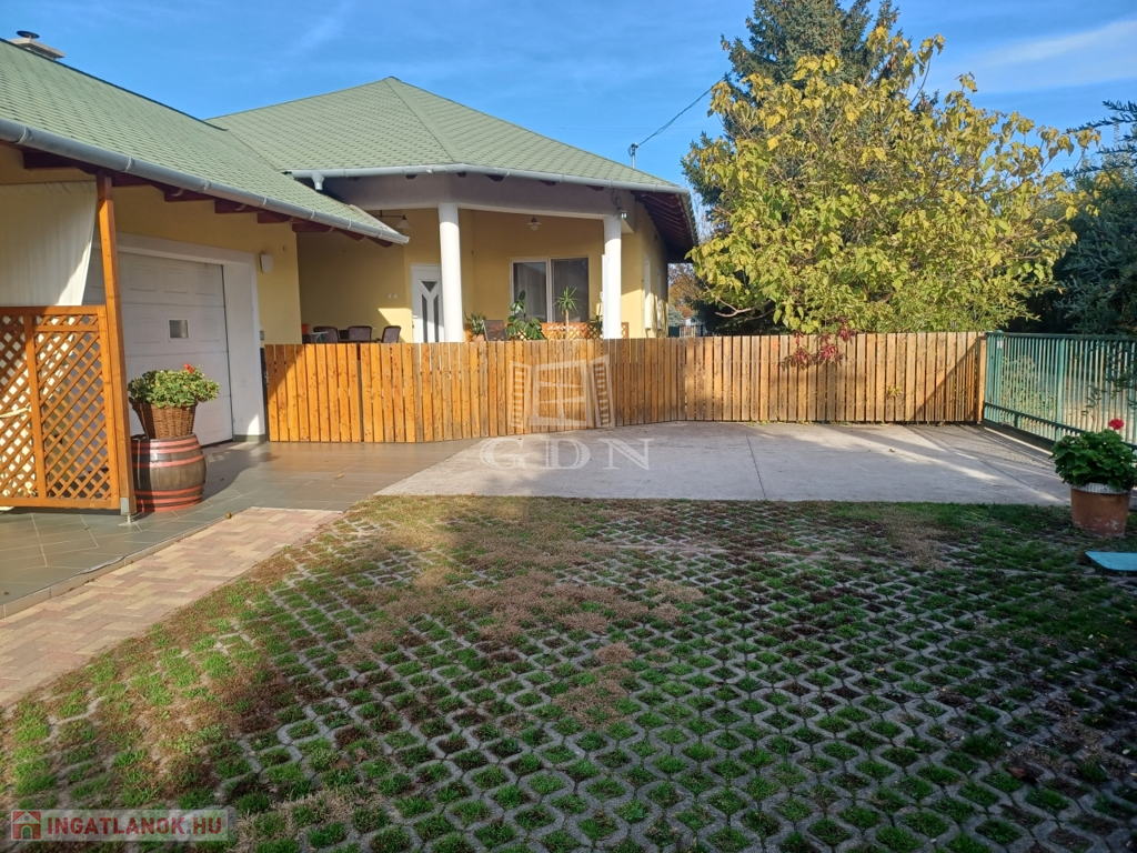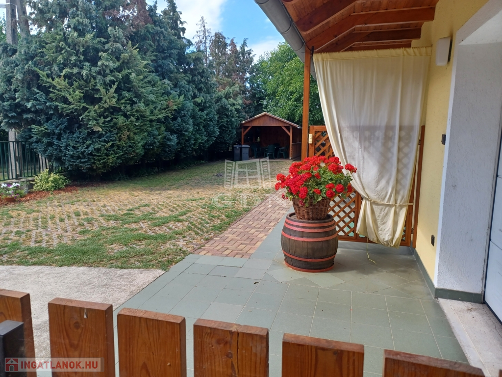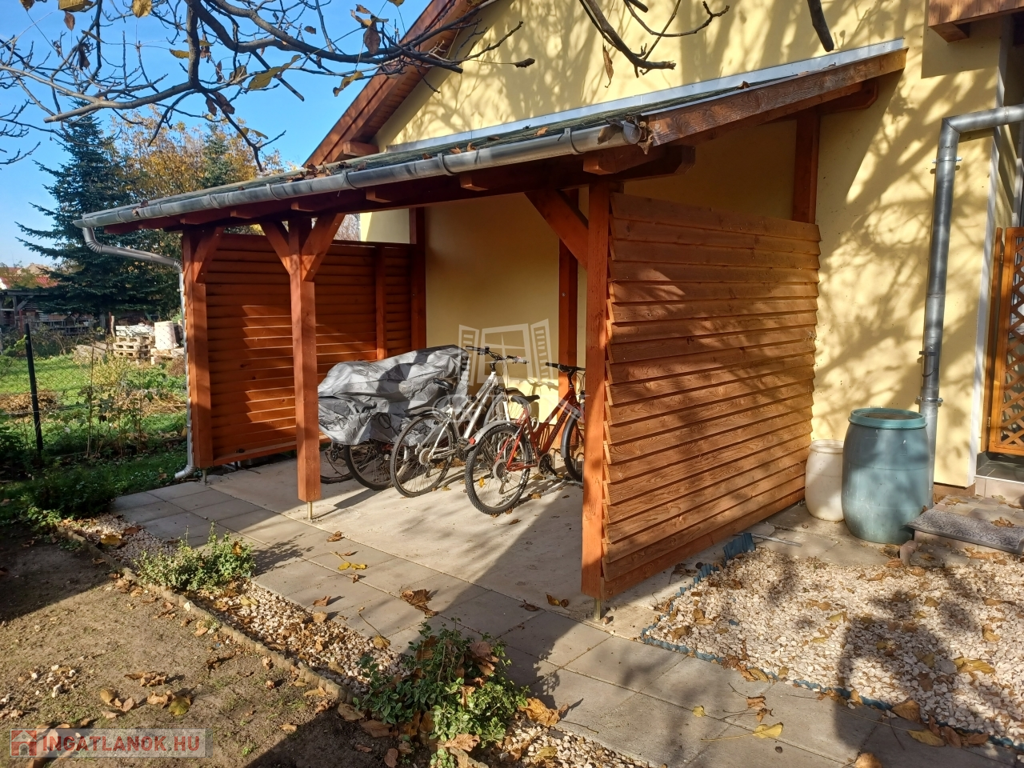 A szépen karbantartott kertben fúrt kút, biciklitároló, fatároló és kerti kiülő biztosítja a további kényelmet. Az udvaron három gépkocsi számára van beállási lehetőség, de az utcán is problémamentes a parkolás.