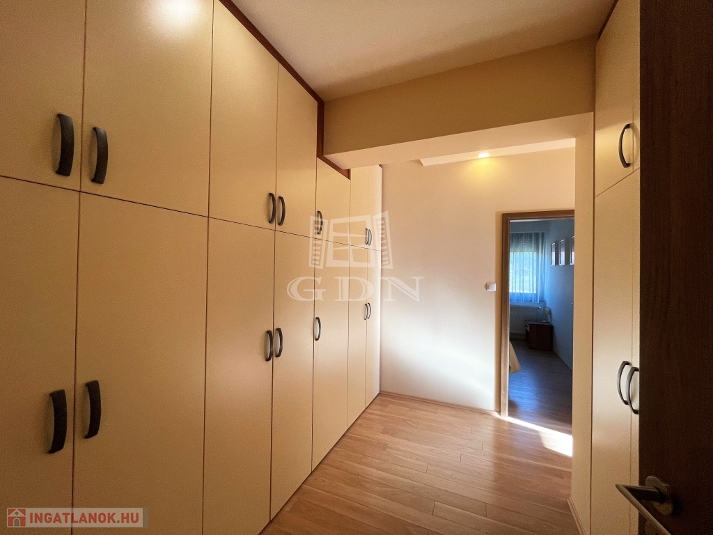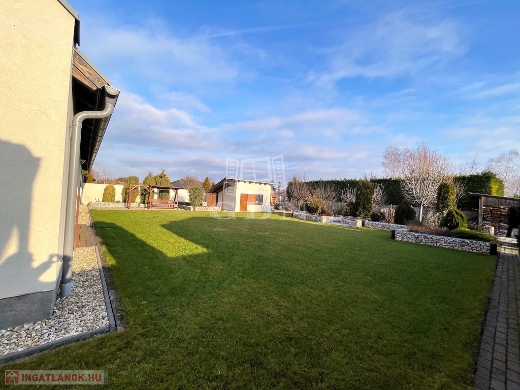 A kertben található még egy 20nm-es kis ház (2cm-es szigeteléssel) járolapozva a kerti eszközök tárolására illetve műhely lehetőséggel. Továbbá egy hintaágy+gyerek hinta illetve egy fedett, körbe zárt 10nm-es fatározó. A kert minden pontján biztosított az áramelérés, 5 helyen van vízcsap (ebből 2 DRV). A füves rész kivételével mindenhova került geotextília. Kb 100m2 a térkövezett felület ami az aszfaltútig kiér mind két kapunál.