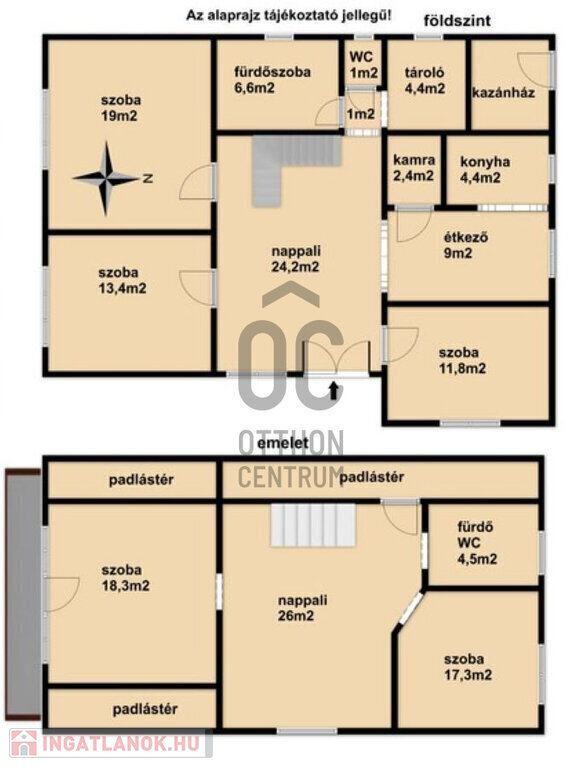 - Helyiségek az emeleten: 2 szoba, nappali, füdőszoba-WC, padlástér (tároló), erkély