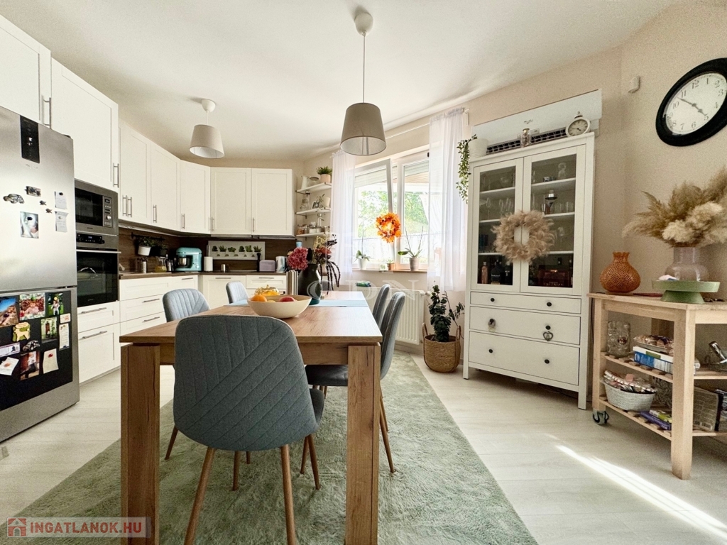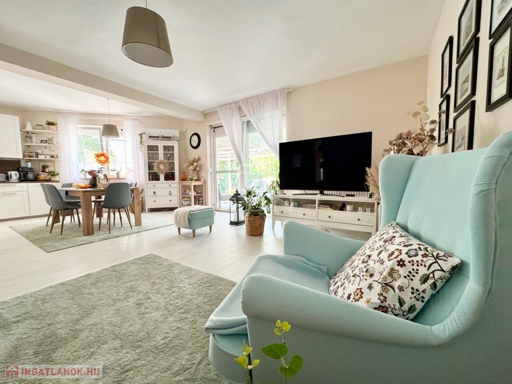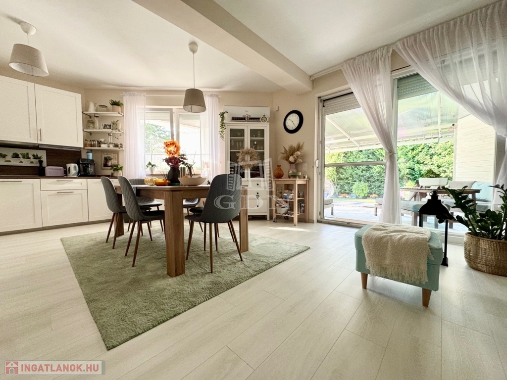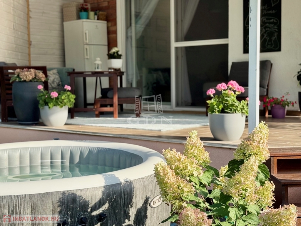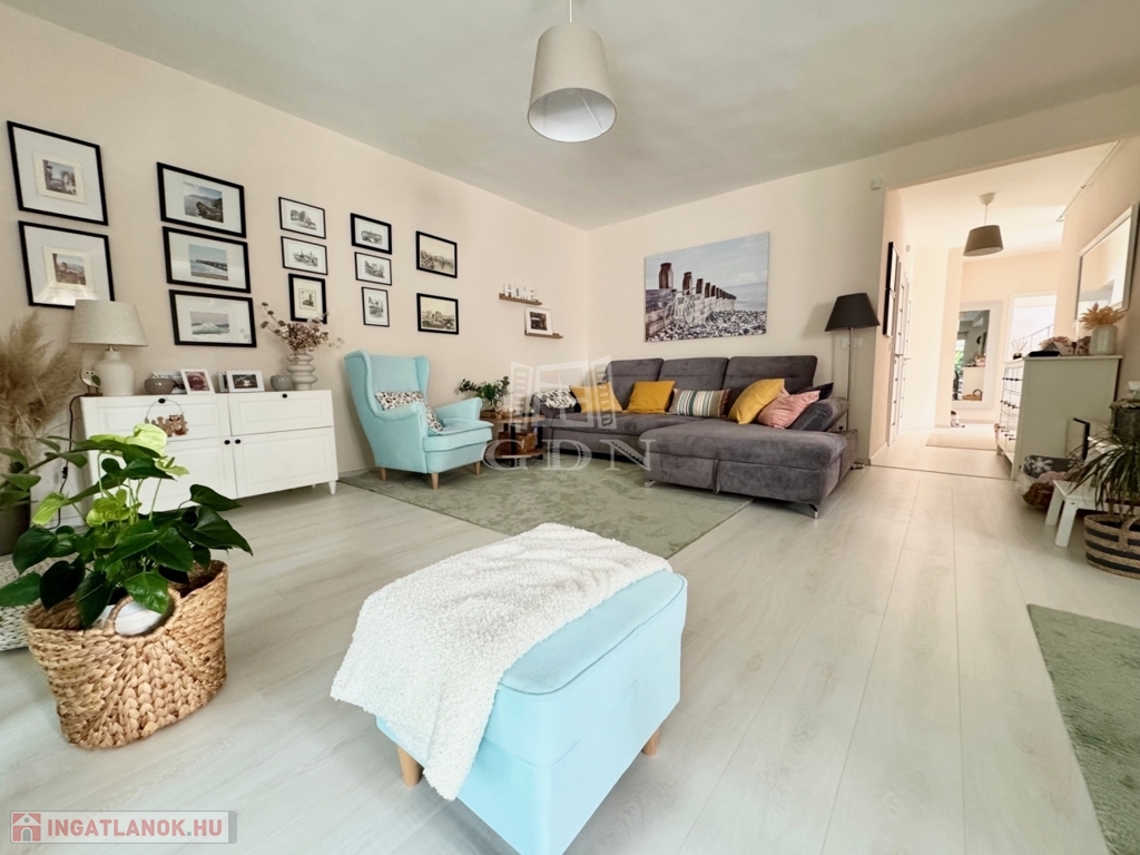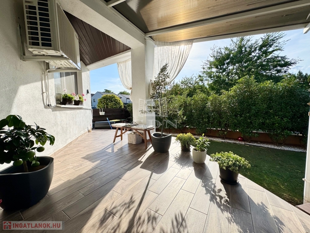 Göd kedvelt városrészén, Oázis lakóparkban, kertvárosi környezetben, csendes aszfaltozott mellékutcában, 2009-ben magas műszaki színvonalon épült, 99 nm-es lakóterületű, nappali + 2 háló + gardrób szobás, (könnyedén minimális költséggel nappali+3 hálóssá alakítható!!), amerikai konyhás, közvetlen kert-teraszkapcsolatos, (kert 210nm + terasz 16 nm) kiváló elosztású, külön nyíló szobás, napos-világos fekvésű, alacsony fenntartású, modern, kondenzációs gázkazán fűtésű, újszerű állapotú, ikerház jellegű, klimatizált, riasztórendszerrel felszerelt lakás, beépített, gépesített konyhával, felszíni gépkocsi beállóval, 8 nm-es fűtött tárolóval, saját, közvetlenül a lakás nappaliából megközelíthető 210 nm-es, gyönyörűen karbantartott, öntözőrendszerrel kiépített kerttel, fúrt kúttal eladó.