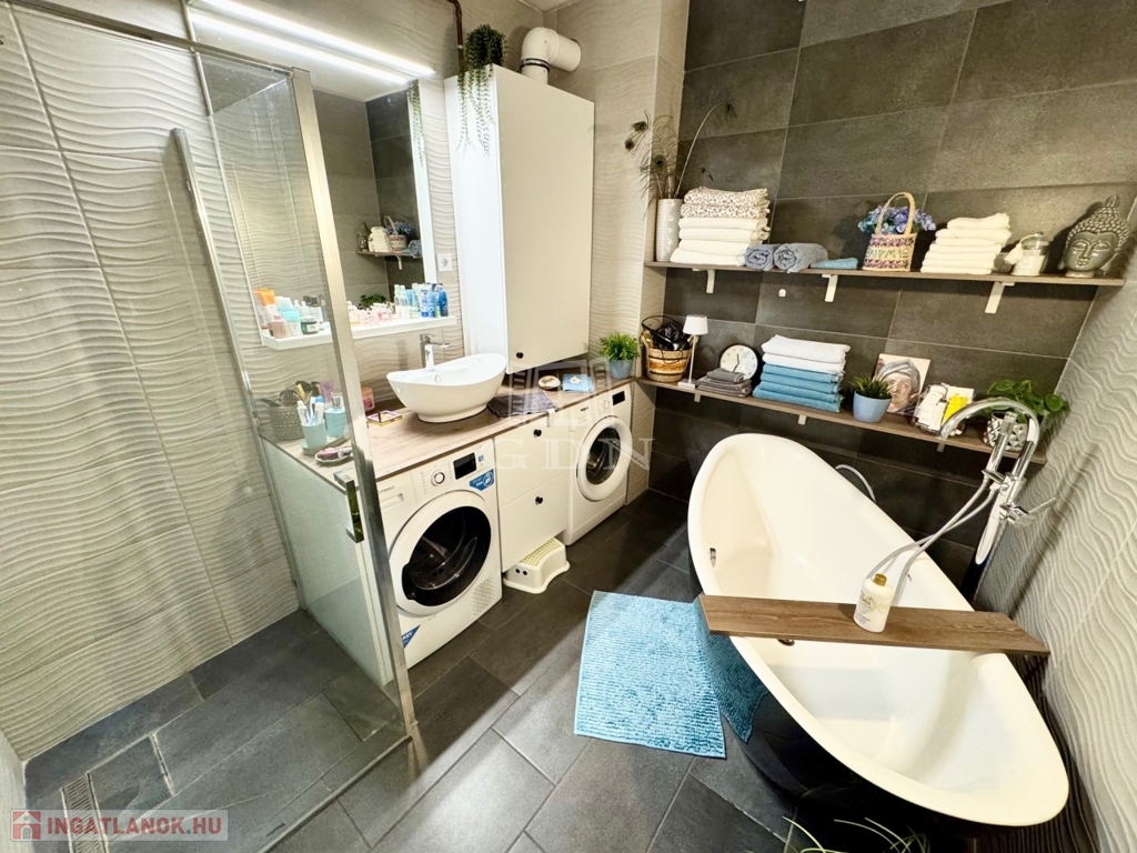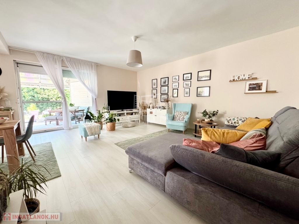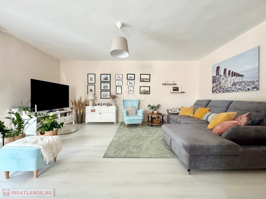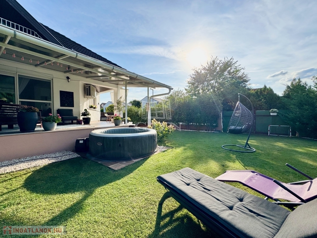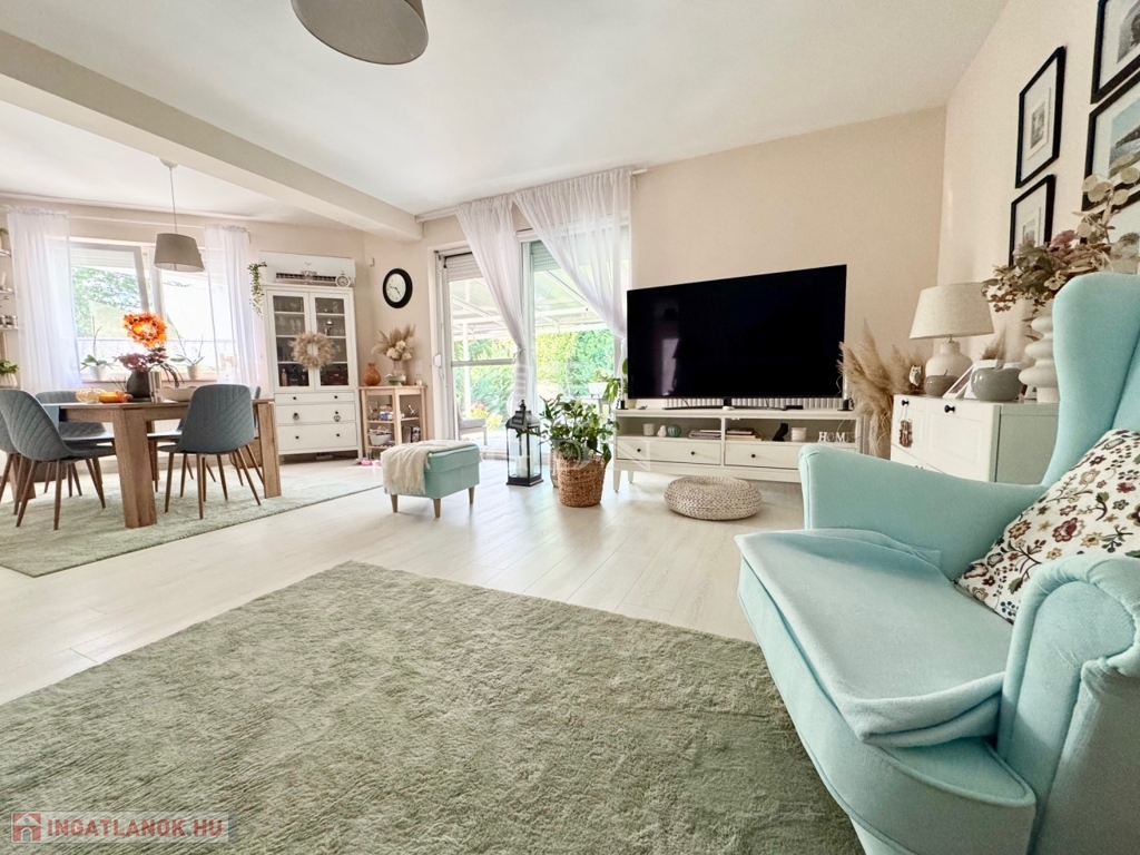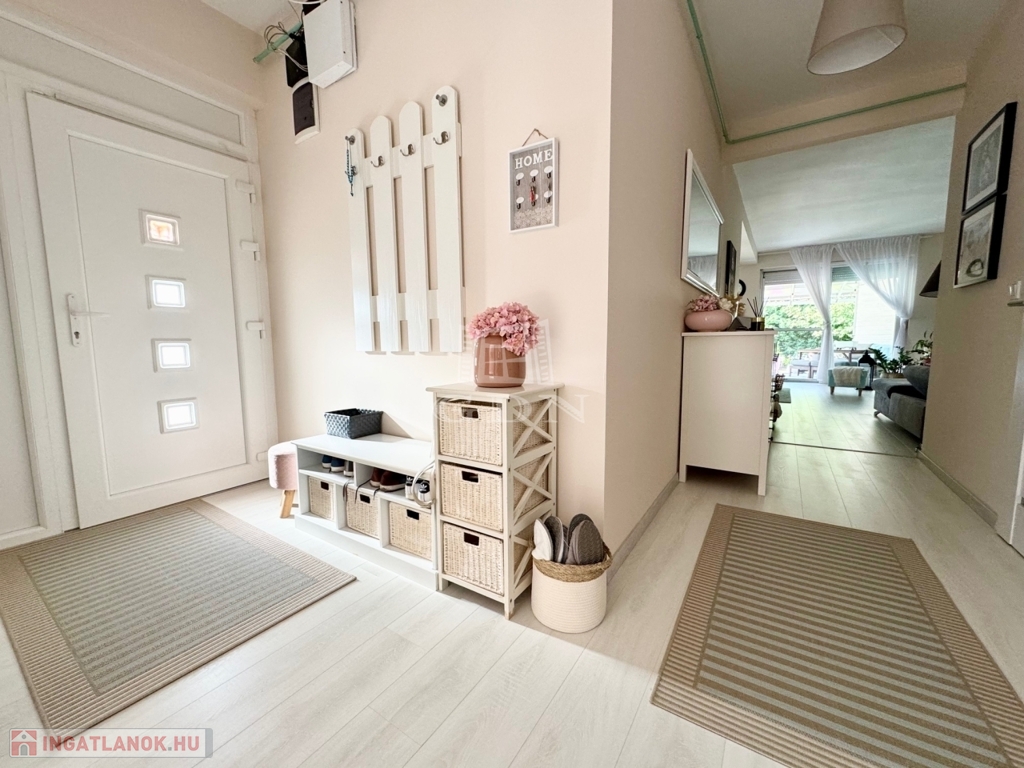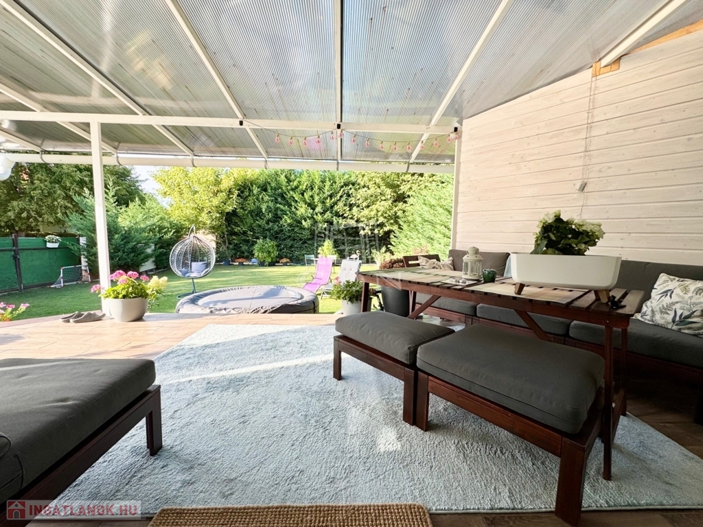 Göd kedvelt városrészén, Oázis lakóparkban, kertvárosi környezetben, csendes aszfaltozott mellékutcában, 2009-ben magas műszaki színvonalon épült, 99 nm-es lakóterületű, nappali + 2 háló + gardrób szobás, (könnyedén minimális költséggel nappali+3 hálóssá alakítható!!), amerikai konyhás, közvetlen kert-teraszkapcsolatos, (kert 210nm + terasz 16 nm) kiváló elosztású, külön nyíló szobás, napos-világos fekvésű, alacsony fenntartású, modern, kondenzációs gázkazán fűtésű, újszerű állapotú, ikerház jellegű, klimatizált, riasztórendszerrel felszerelt lakás, beépített, gépesített konyhával, felszíni gépkocsi beállóval, 8 nm-es fűtött tárolóval, saját, közvetlenül a lakás nappaliából megközelíthető 210 nm-es, gyönyörűen karbantartott, öntözőrendszerrel kiépített kerttel, fúrt kúttal eladó.
