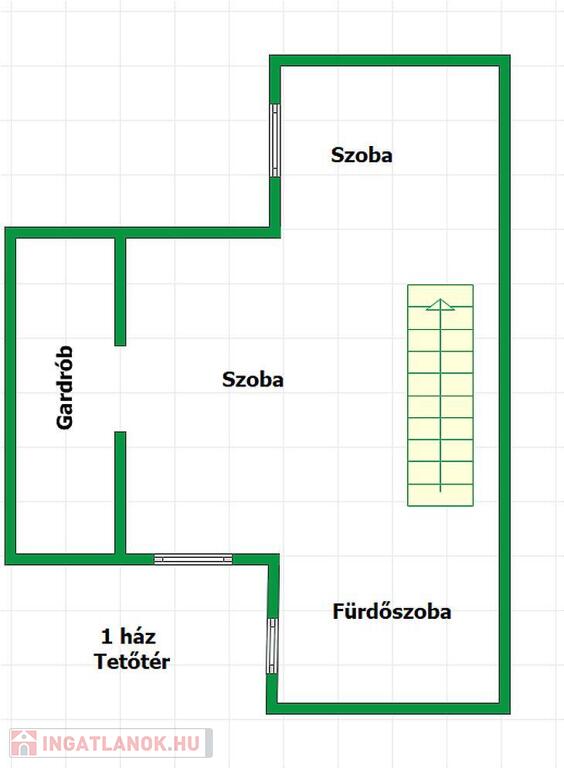 Az első ház 90 nm, 2007-ben épült, 38-as Leier téglából, belső kétszintes kialakítással. A földszinten nappali, konyha, hálószoba, kamra és egy hangulatos terasz található. A tetőtér jelenleg nincs teljesen befejezve, azonban minden gépészeti előkészítés megvan (fűtés, víz) a nyílászárók be vannak építve – így könnyedén kialakítható benne további két hálószoba és egy fürdőszoba.