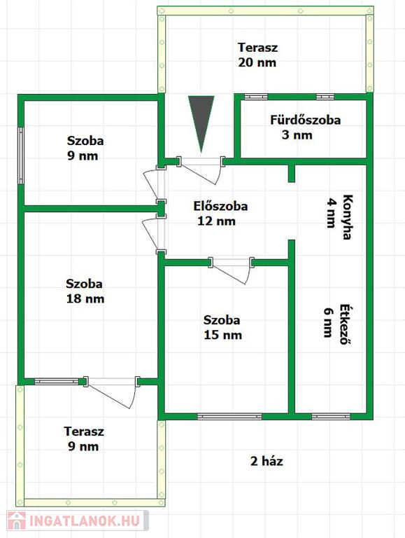 A második ház 70 nm,1980-ban lett bővítve, és egy klasszikus elrendezésű, 3 szobás, konyhával, fürdőszobával, előszobával és terasszal.