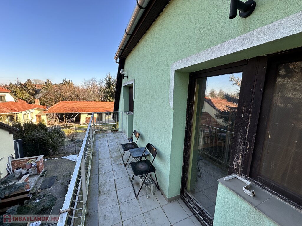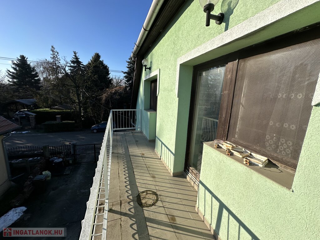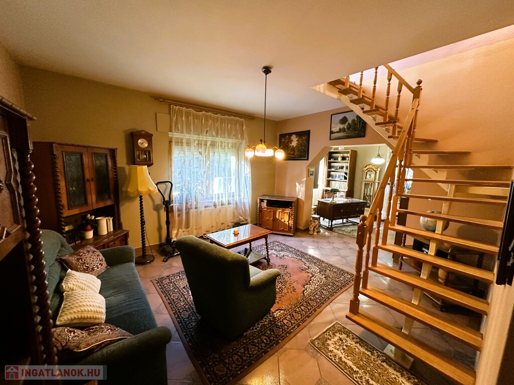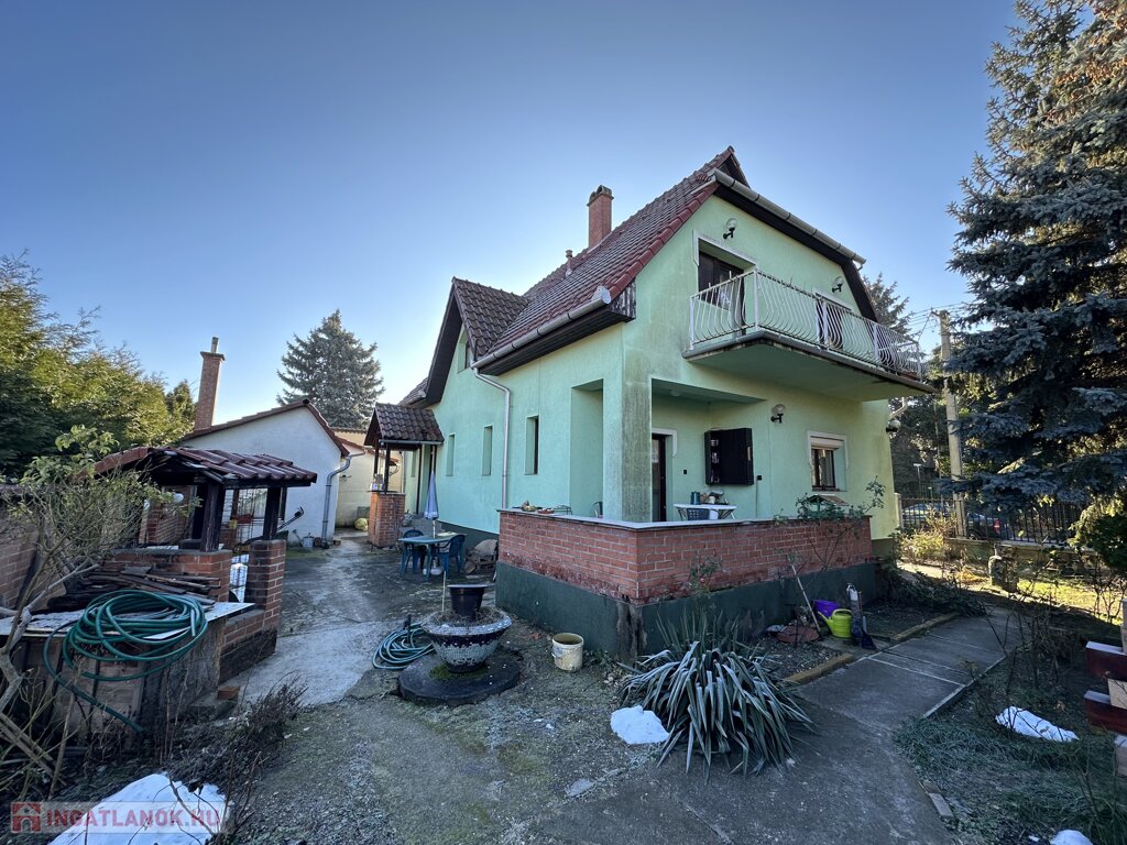 A nagyobbik ház kétszintes, dupla komfortos, nettó 156 m2 alapterülettel és 6 tágas szobával rendelkezik, melyek mindegyike különnyílóak. 1994-ben épült 38-as téglából és erre került 5 cm szigetelés. A fűtésről és a meleg vízről gázcirkó gondoskodik, minden helyiségben található radiátor. A gondos megtervezett és kivitelezett ablakoknak köszönhetően, valamint a kertkapcsolatos terasznak, a 2 erkélynek és 1 franciaerkélynek köszönhetően rendkívül világos élettereket biztosít. A földszinten foglal helyet egy tágas fogadótér, külön álló mellékhelység, zuhanyzós fürdőszoba, hálószoba, konyha, kamra,, valamint a nappali, melyből a képeken látható módon le van választva egy kis dolgozó, A konyhának nagy előnye, hogy kertkapcsolatos, egy ajtó választja el a 11 m2-es részben fedett terasztól, így a reggel frissen lefőtt kávét a nyugodt, zöld kertet nézve lehet elfogyasztani. Az emeleten 4 szoba helyezkedik el, melyből az egyik jelenleg könyvtárként funkcionál, megtalálható továbbá egy kádas fürdőszoba, melyben természetesen wc is helyet kapott, nappali (közlekedő), két terasz, valamint egy franciaerkély. A jól megtervezett és elhelyezett, 7m2-es teraszok előnyeit mindegyik szobából maximálisan ki lehet élvezni.