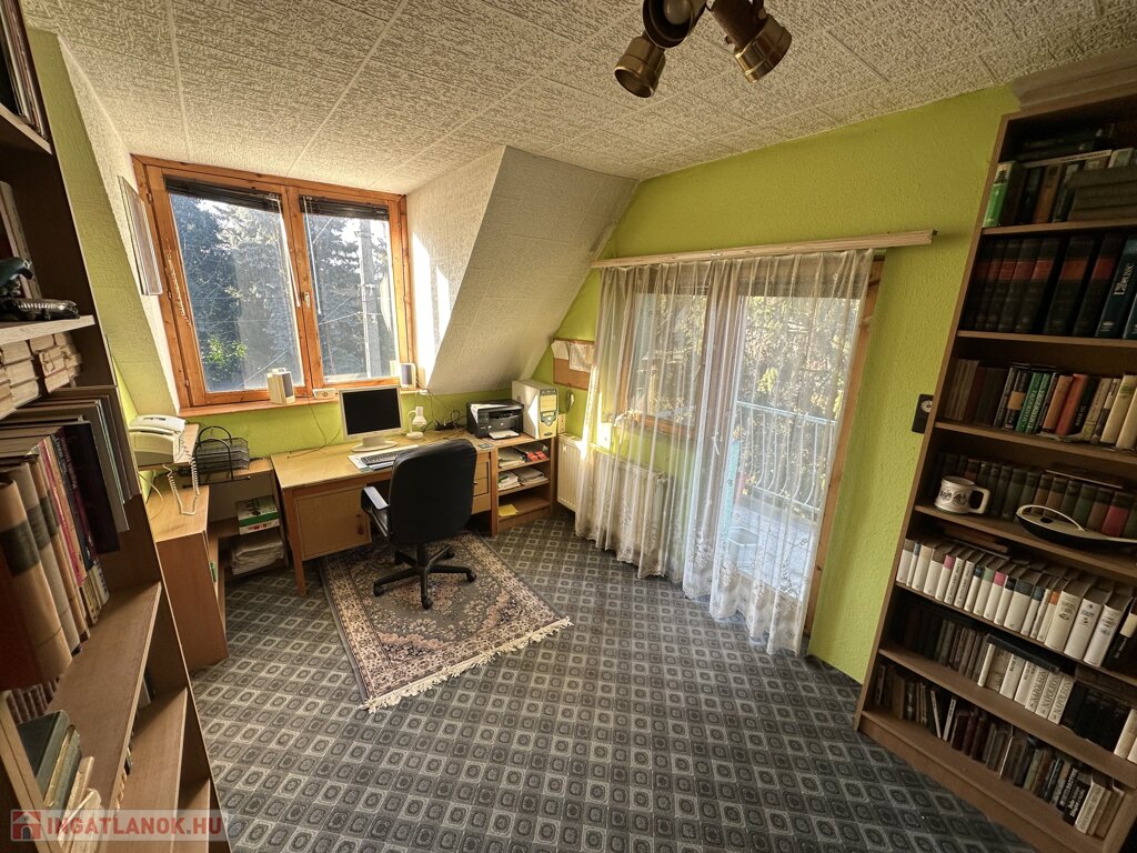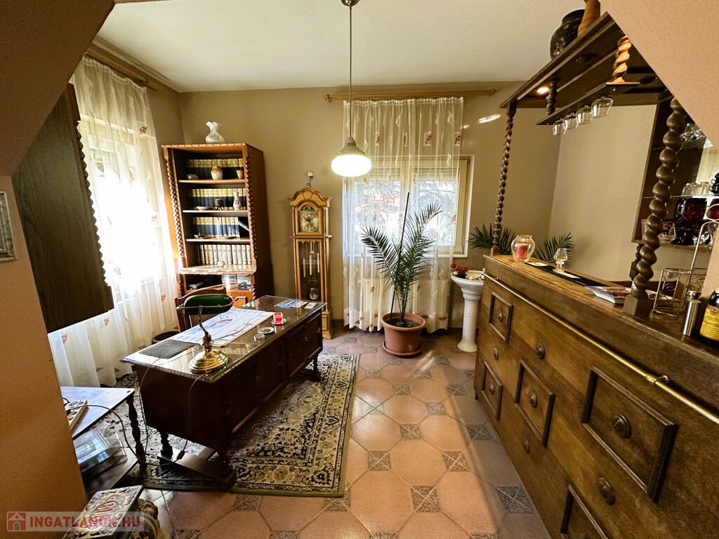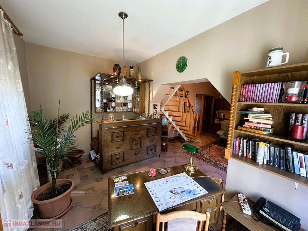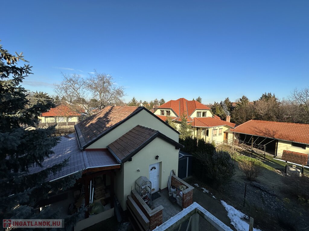 A nagyobbik ház kétszintes, dupla komfortos, nettó 156 m2 alapterülettel és 6 tágas szobával rendelkezik, melyek mindegyike különnyílóak. 1994-ben épült 38-as téglából és erre került 5 cm szigetelés. A fűtésről és a meleg vízről gázcirkó gondoskodik, minden helyiségben található radiátor. A gondos megtervezett és kivitelezett ablakoknak köszönhetően, valamint a kertkapcsolatos terasznak, a 2 erkélynek és 1 franciaerkélynek köszönhetően rendkívül világos élettereket biztosít. A földszinten foglal helyet egy tágas fogadótér, külön álló mellékhelység, zuhanyzós fürdőszoba, hálószoba, konyha, kamra,, valamint a nappali, melyből a képeken látható módon le van választva egy kis dolgozó, A konyhának nagy előnye, hogy kertkapcsolatos, egy ajtó választja el a 11 m2-es részben fedett terasztól, így a reggel frissen lefőtt kávét a nyugodt, zöld kertet nézve lehet elfogyasztani. Az emeleten 4 szoba helyezkedik el, melyből az egyik jelenleg könyvtárként funkcionál, megtalálható továbbá egy kádas fürdőszoba, melyben természetesen wc is helyet kapott, nappali (közlekedő), két terasz, valamint egy franciaerkély. A jól megtervezett és elhelyezett, 7m2-es teraszok előnyeit mindegyik szobából maximálisan ki lehet élvezni.