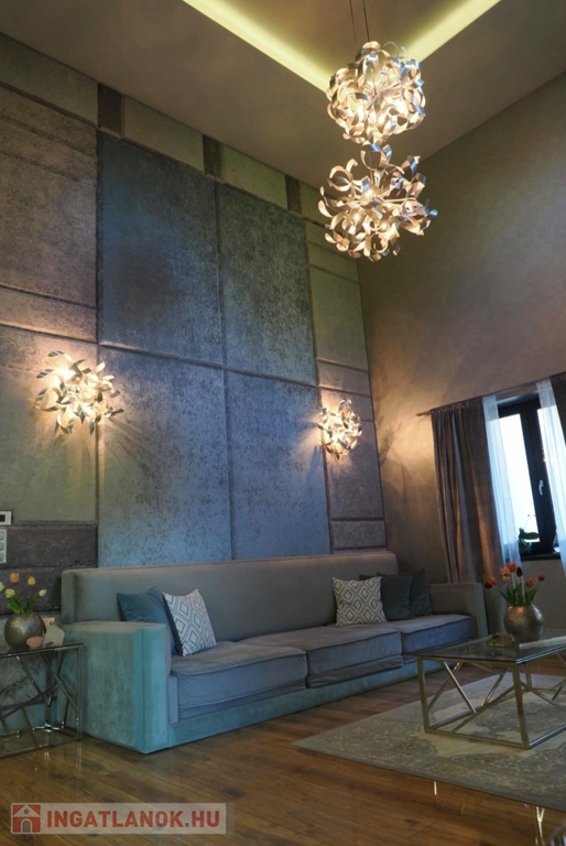 A ház fő éke a földszint izgalmas nappali-társalgó helysége, mely impozáns 6 métert meghaladó belmagasságával, kárpitozott falpanellel borított falával, a tökéletes komforthoz gyártott egyedi design bútoraival, és palakővel burkolt kandallójával magas fokon ad teret minden összejövetelnek.